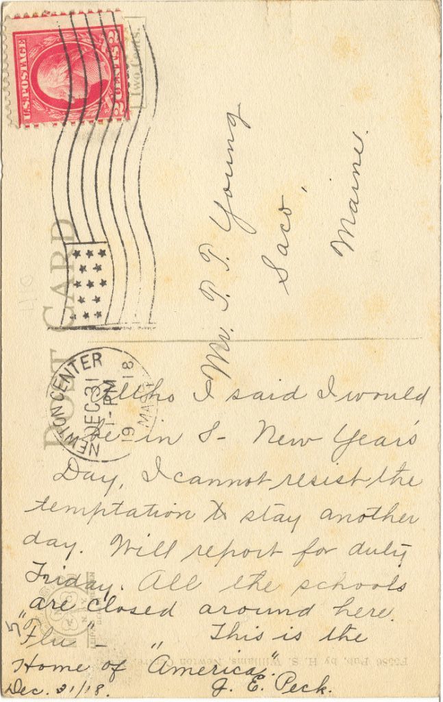 The sender of this card, J. E. Peck, mentions in his message that “This is the home of America.”  Peck dated the message, December 31, 1918, and the card was postmarked at 1 PM the same day.  The rest of the message was:  Altho [sic] I said I would be in Saco New Year’s Day, I cannot resist the temptation to stay another day.  Will report for duty Friday [January 3, 1919].  All the schools are closed around here.  “Flu.