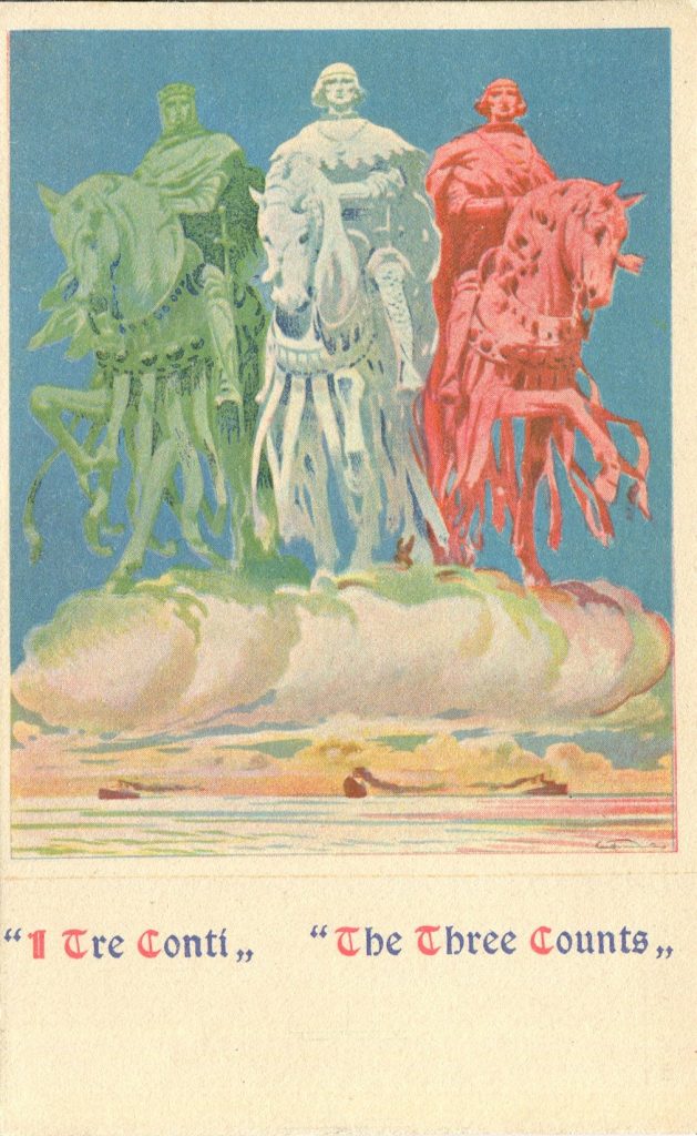 Even the casual observer will notice that the image presents in three colors: green, white, and red – the colors of the Italian flag. The counts appear heraldically on horseback in battle garb and they ride to their destinations on a huge white cloud over a sea of vibrant color. Who are these heroes? They are Nazario Sauro, a noted Italian navigator; Dante Alighieri, the poet; and Giuseppe Verdi, the composer.