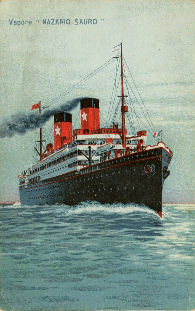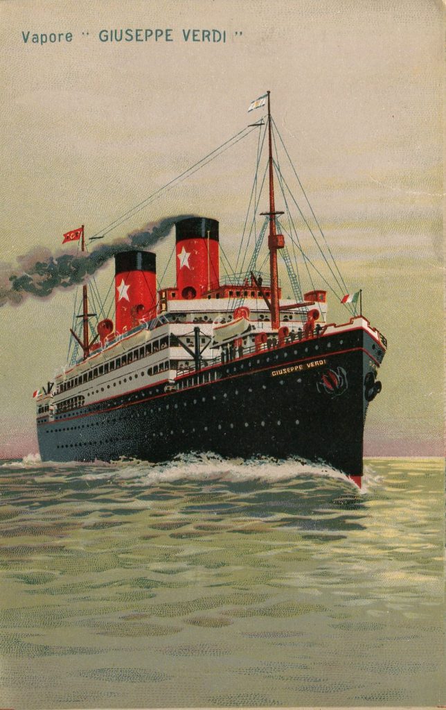 This allegorical presentation is of thee ships that once sailed under the Italian flag from circa 1907 to 1913 to the end of World War II for the Transatlantica Italiana. As they are pictured on the cards below, the fact of their identity is obvious. Each ship had three compartments with 128 rooms and a grand ballroom. Each was built and used to sail the Atlantic between Italian ports and the North American continent. Each was 426 feet in length and scaled at 8,150 gross tons. It should not surprise anyone to learn that in their later years of service they sailed under different flags (due to wartime confiscation/reparation) and under different names.