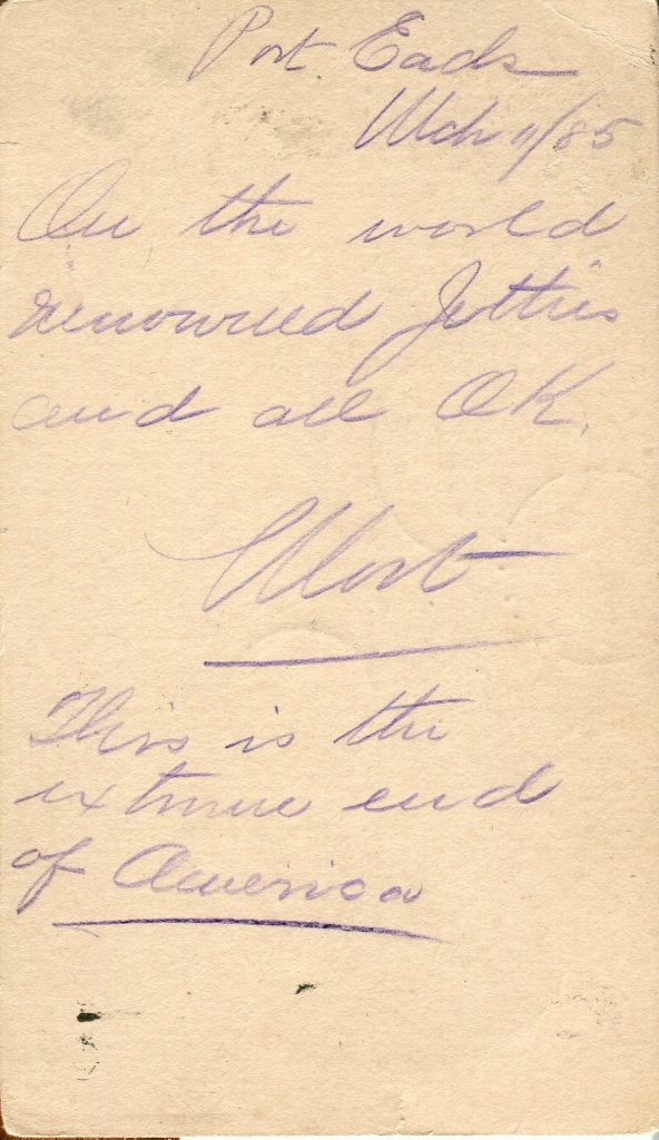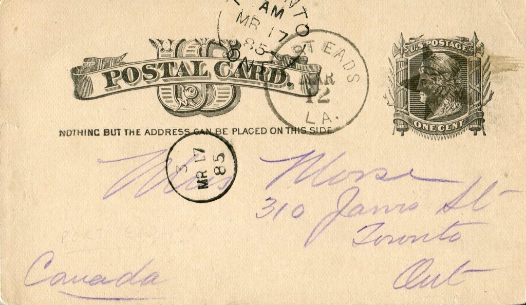 This card was sent from Port Eads, Louisiana on March 12, 1885, to Toronto, Ontario, Canada. The message is: