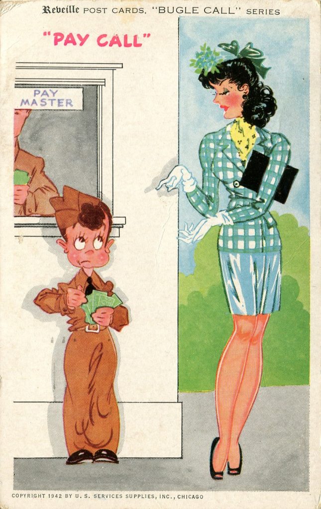 My curiosity about this set developed because of the message on the Pay Call card seen above. The theme is a common dominant woman/diminutive man card but with a military nuance. Most interesting is that the message refers more to the image than the weather that he mentions as, ‘beautiful.’