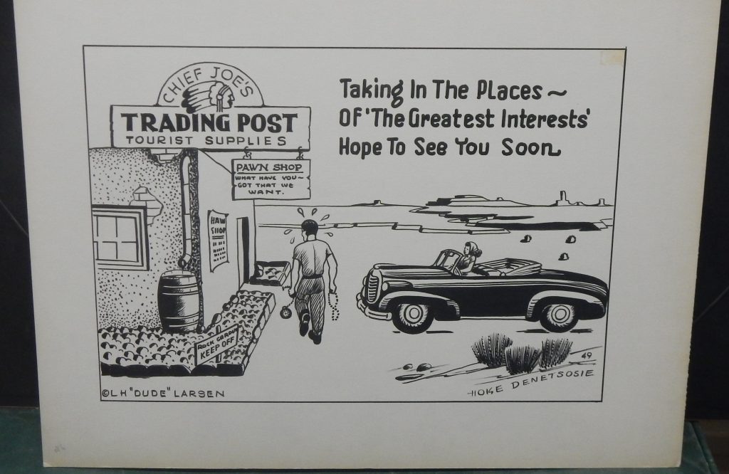 There were 14 original works by Dude and Dot Larsen uncovered on this estate in the little town of Woodland, California. The paintings were part of an estate belonging to Larsen’s son and daughter-in-law who preserved the paintings since L. H. Larsen passed in 1997. In addition to the art, the estate has over a thousand postcards, including a collection of black and white cards and large hand drawn storyboards illustrating the work of Hoke Denetsosie, a Navajo artist- illustrator. Also, in the collection are several etched copper stamps used for hand printing postcards.