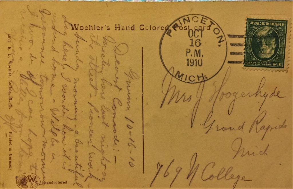 This card features the Escanaba River in Michigan’s Upper Peninsula (The “U.P.”). It was a beautiful river when this card was mailed on October 16th, 1910, and it still is. The address-side tells a different story. It was written in Gwinn, Michigan and mailed from nearby Princeton to Grand Rapids, Michigan. Both Gwinn and Princeton are in Marquette County, the location of one of the iron ranges of the Upper Peninsula.