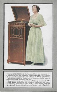 themselves and the company. Several singers were also induced in the early 1900s to serve as spokespersons for other music-oriented products. Julia Heinrich, for example, assured listeners that Mr. Edison’s “talking machine” could produce sounds identical to her own voice.