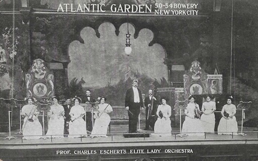 During the 19th century the Bowery was a respectable entertainment district but that began to change with the coming of the 3rd Avenue Elevated Railway, lasting from 1878 to 1955, which covered the street in semi-darkness and occasionally spewed hot ash to the sidewalks below. In this c.1910 street view published by Theodor Eismann, the Bowery may still have been a rowdy place with mixed entertainment, like the Elite Lady Orchestra at Atlantic Garden. Unfortunately, the street kept moving downhill.