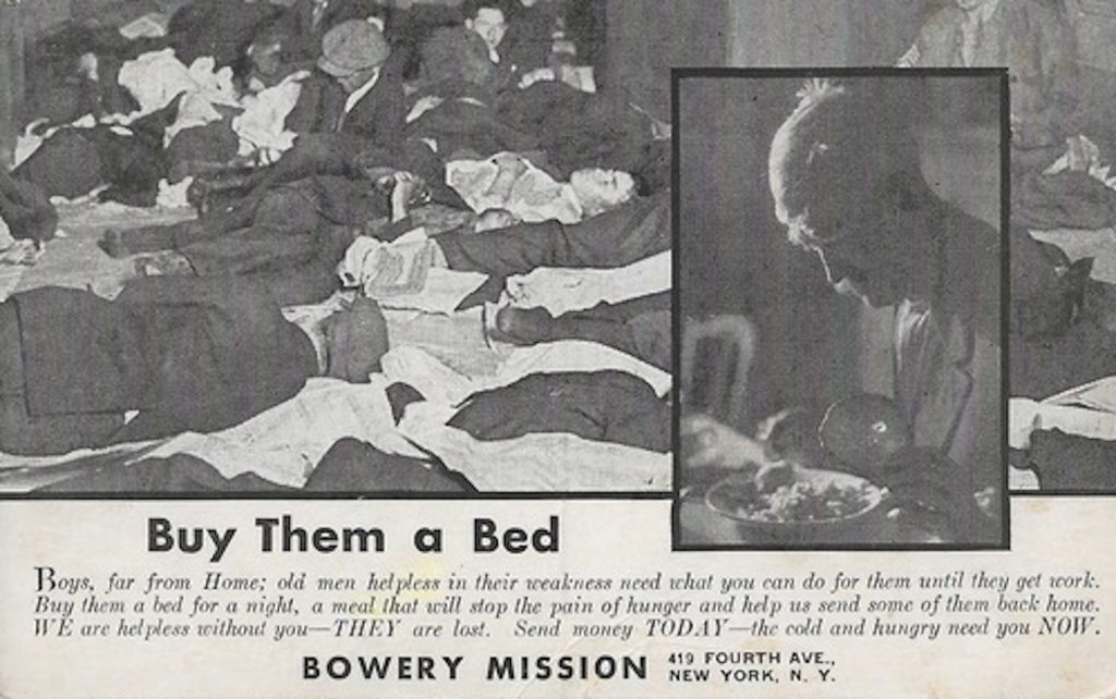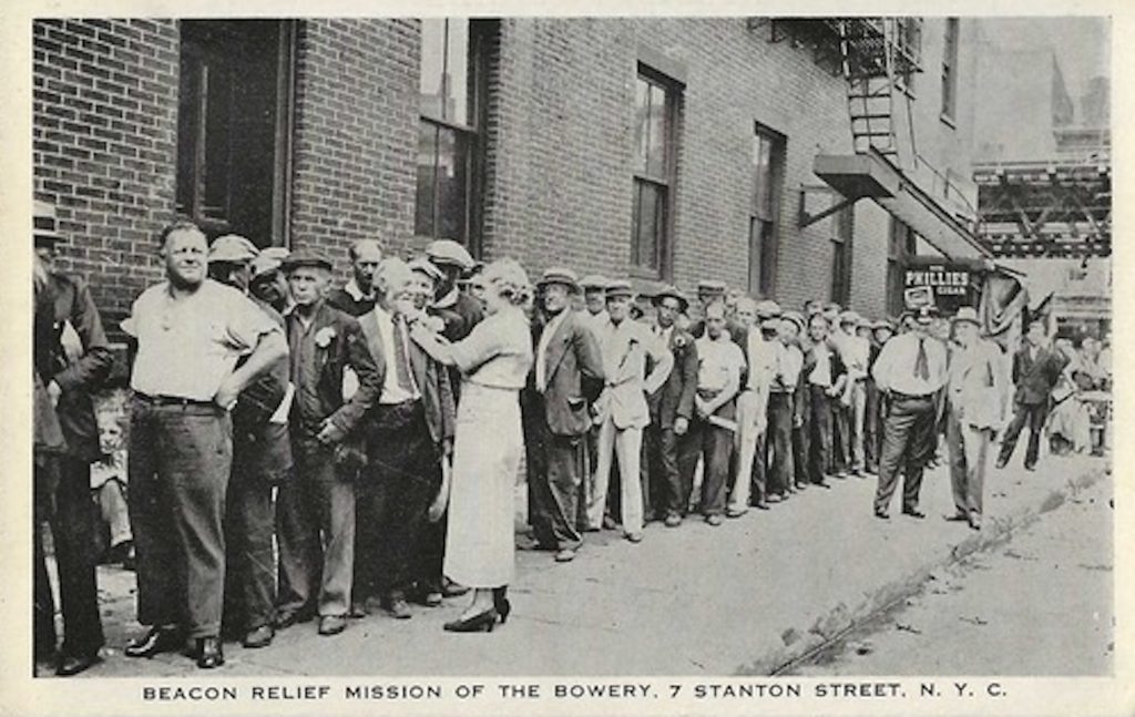 By the 1930s to the ‘60s the scene had lost its glamor. It was dominated by cheap restaurants and saloons, tattoo parlors, barber schools for cheap haircuts, day-labor employment agencies, missions, soup kitchens, cheap hotels, called “flophouses,” and streams of panhandlers. The Bowery was synonymous with vagrants sleeping in doorways.