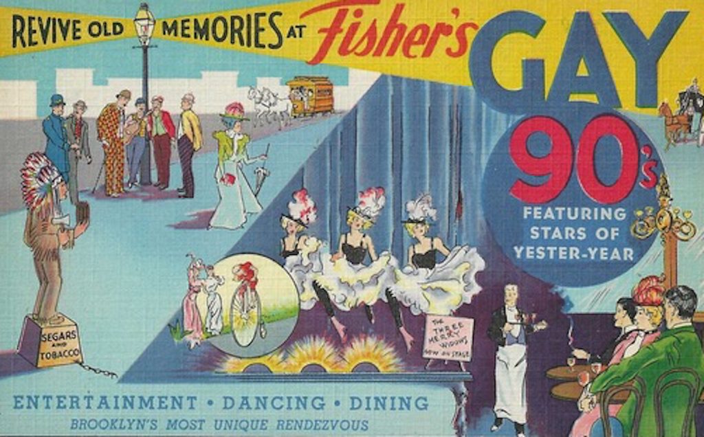 The music format was Gay 90s, nostalgically recalling the era of the Floradora Girls and the Ziegfeld Follies, ladies in big hats ornamented with ostrich feathers, men in top hats, bowlers or straw boaters. Other cabarets around the city featured Gay 90s performers, like Fisher’s in Brooklyn and Bill’s Gay 90s in Midtown Manhattan but Sammy’s was different.