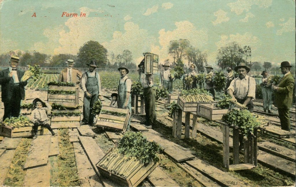 In 1913, when this card was mailed, the No. “3” cash crop in central and northern parts of [Answer from column one] was the vegetable being harvested in the picture postcard above. [Answer from column two] grows best in the months of December through May. Because the average temperature of the area was always 70° Fahrenheit, the farmers and growers managed to harvest two crops in the years without temperature extremes.