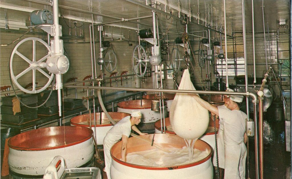 There are many places where [answer from column two] is made using the age-old European recipe. One American manufacturer in [answer from column one], only eight miles north of the Illinois State Line, proudly advertised the new equipment they recently installed on this 1958 chrome postcard. The caption explains that the curd is gathered by allowing the whey to drip away through a special cloth.