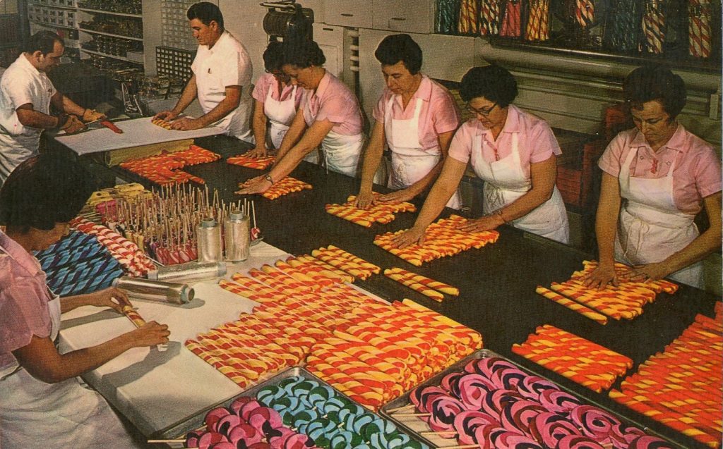 At the Nut Tree Kitchen, hundreds of employees who work at the factory in [city and state from column one] are permitted to sample the product, but few do. It may be a case of “too much of a good thing.” The workers shown on the 1968 chrome postcard above work side-by-side on a stone-top table where they shape and package sticks and suckers for shipment to one of the Nut Tree’s twenty-six locations. Their job title is one word: [answer from column two.]