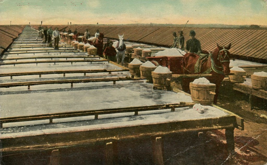 There are those who think that [city and state from column one] sits atop a series of mines. Not true. The successful [answer from column two] industry in the city is the result of a particulate in the water from a lake at the western edge of the city. The particulate was extracted from the water by evaporation or boiling. In the solar evaporation method, the water was pumped into large, shallow vats as seen in the postcard and exposed to the sun. The city was one of the top producers of this product for most of the 19th century.