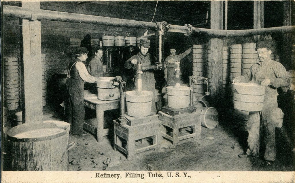 The same was true at other slaughterhouses, but in some cases the non-muscle leftovers had to be refined. As you may imagine, the process was hot and smelly, but working in the [answer from column two] refinery was a highly skilled job and in locations like [city and state from column one] the salary was good. One company which fairly pioneered the industry was W. J. Wilcox of New York. The postcard above shows the product being packaged for shipment in rope-handled, oak barrels that were transported by train to businesses across the country. Remember in the 1920s, this product was used by many different businesses from restaurants, to candle crafters, and soap makers.