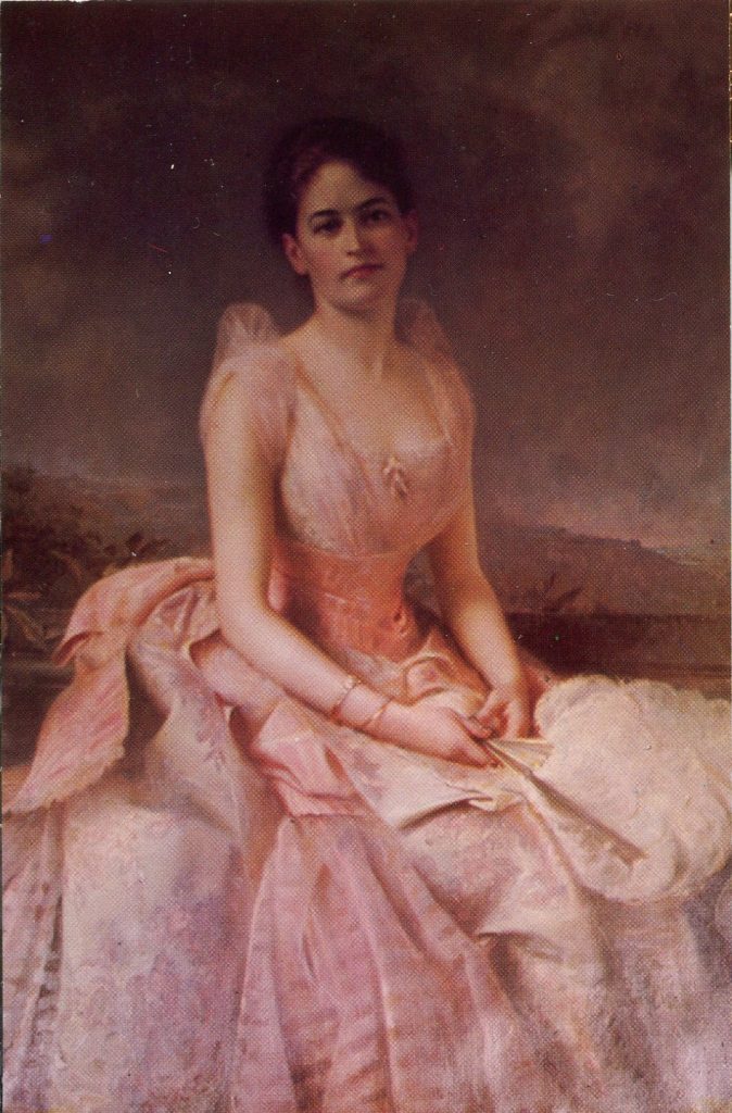 This pre-1960s era chrome postcard, printed by the Walter Miller Company of Williamsburg, Virginia, shows her portrait by Edward Hughes. It was painted in London in about 1887. Mrs. Low is seen wearing the pink gown that she wore when she was presented to Queen Victoria.