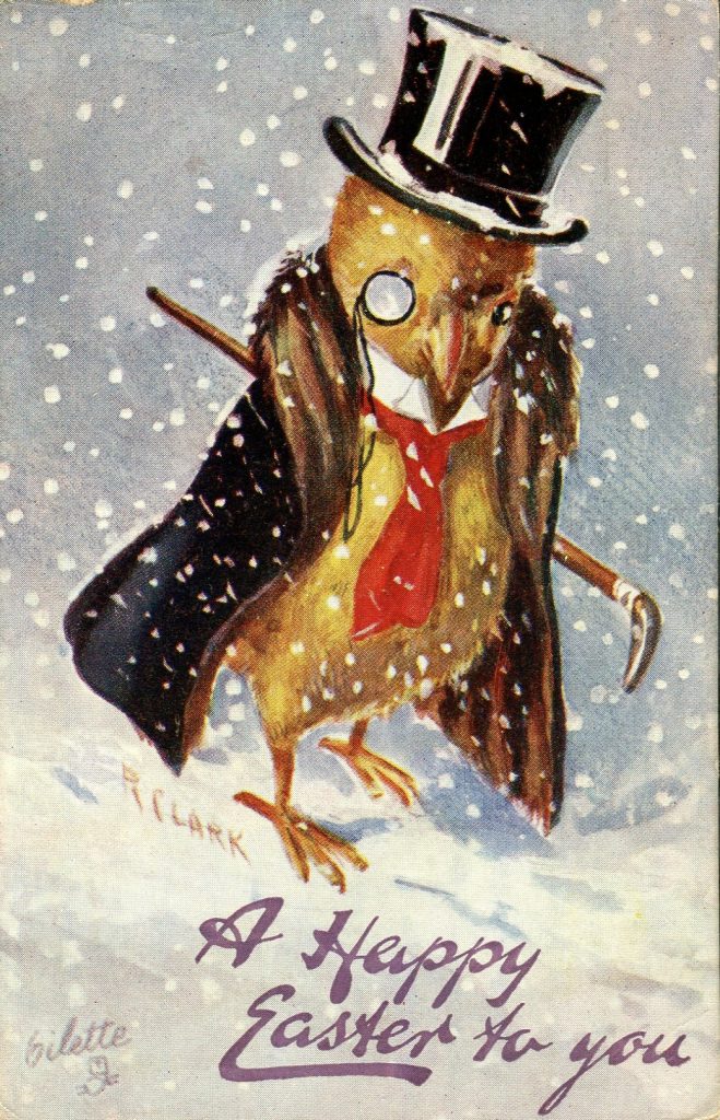 The New York office of Raphael Tuck & Sons published a rare 12-card set entitled Easter in Chickland. The signed-artist was “R. Clark” (there is conjecture that “R. Clark” is Rose Clark, a highly-skilled artist and photographer from Indiana, but it is a weak and unlikely suggestion). The set was made for sale only in North America around 1920, however some of the images appeared in sets for sale in England and France as early as 1913 without the Easter greeting.