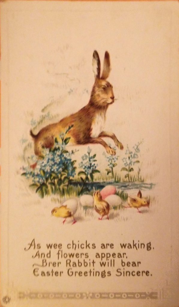 At some point Brer Rabbit and the Easter Bunny came together in popular culture. From what I can find on the postcards and in old newspaper articles this version of the Easter Rabbit was popular between 1900 and 1940. A forgotten but still interesting fusion of folkloric characters from different cultures come together in the American melting pot.