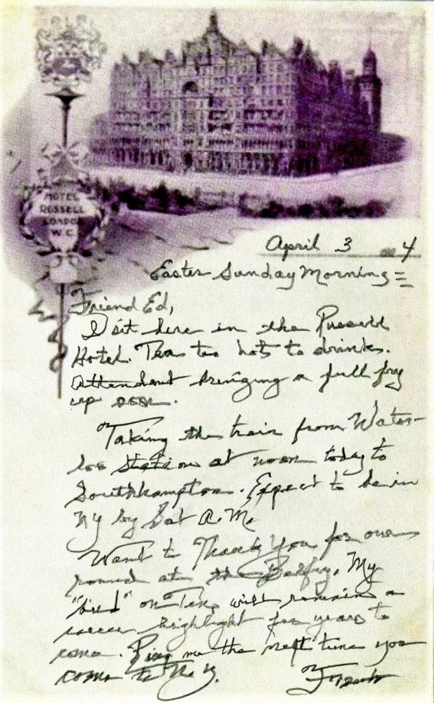 [Editor’s note: The Russell Hotel sits at 1 Russell Square, in the Bloomsbury neighborhood of London. The card below is dated by the sender on Easter Sunday morning in 1904. Apparently, Frank was a lone American awaiting the noonday train from Waterloo Station to Southampton where he planned to board a ship bound for New York City. Frank’s penmanship most likely never won an award for neatness, ergo the message is transcribed to assist our readers.]