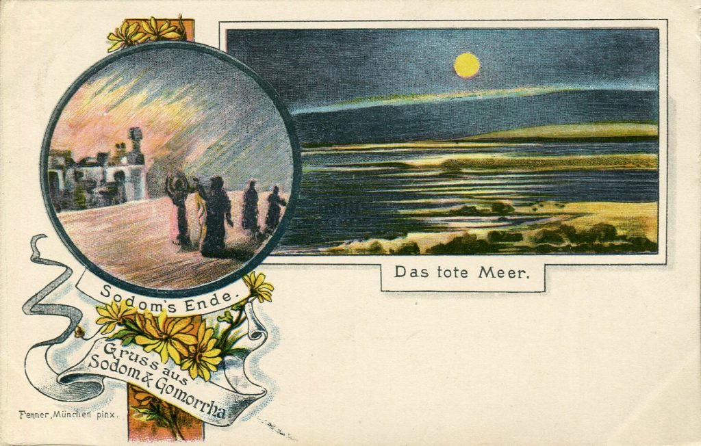 Now I’m not making a claim or stating a fact, but certainly the first pair of twin-cities that come to mind are two biblical towns which figure prominently in the story of Lot and his wife (she is never named). They are Sodom and Gomorrah. [Do you have any idea how deep I had to dig to find a postcard of these places?]