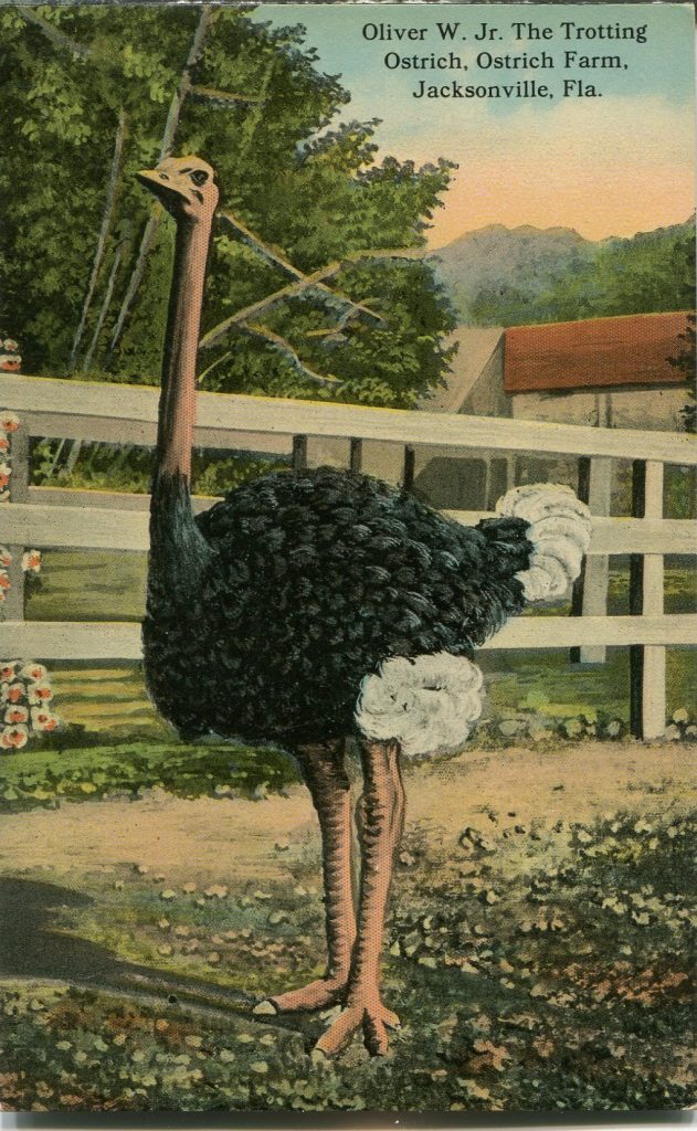 Oliver entertained the visitors at the Florida Ostrich Farm, a parkland attraction on the south bank of the Saint John’s river that from 1910 to 1919 was a “must-see” for Jacksonville vacationers. If you wanted, you could take a local streetcar directly to the farm.