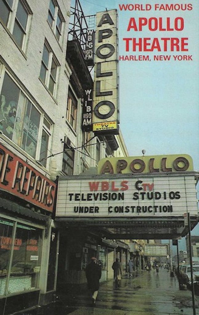 Two cards below illustrate the Apollo’s location and evolution: First a linen-era street scene of 125th, showing the Apollo and other theaters that shared the block. The next card shows the venerable old theater several decades after its heyday when it had become a studio and headquarters for several other black-oriented media properties.