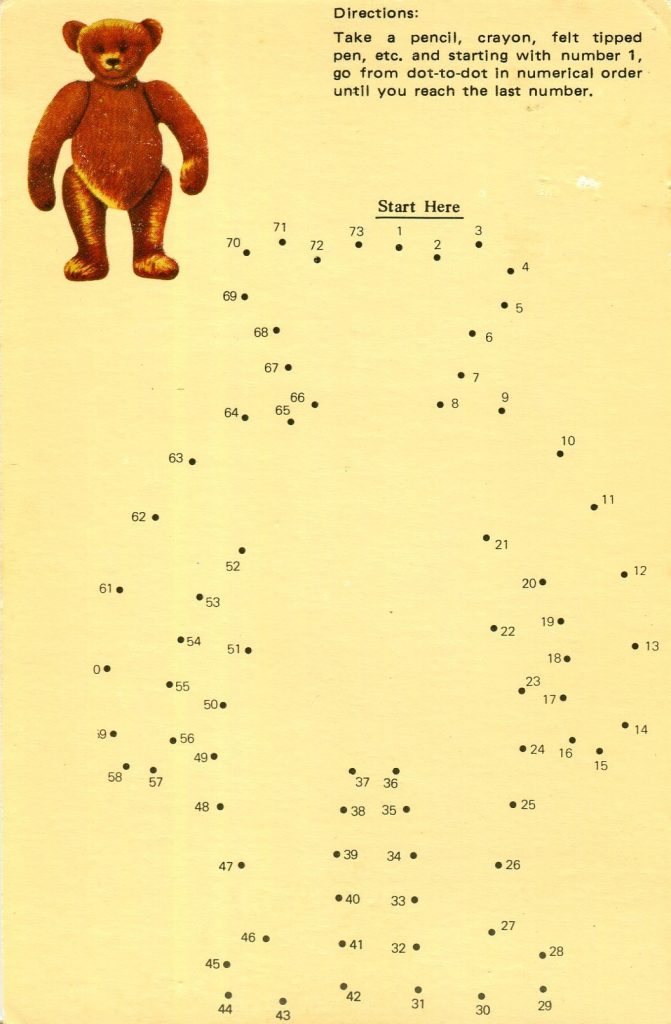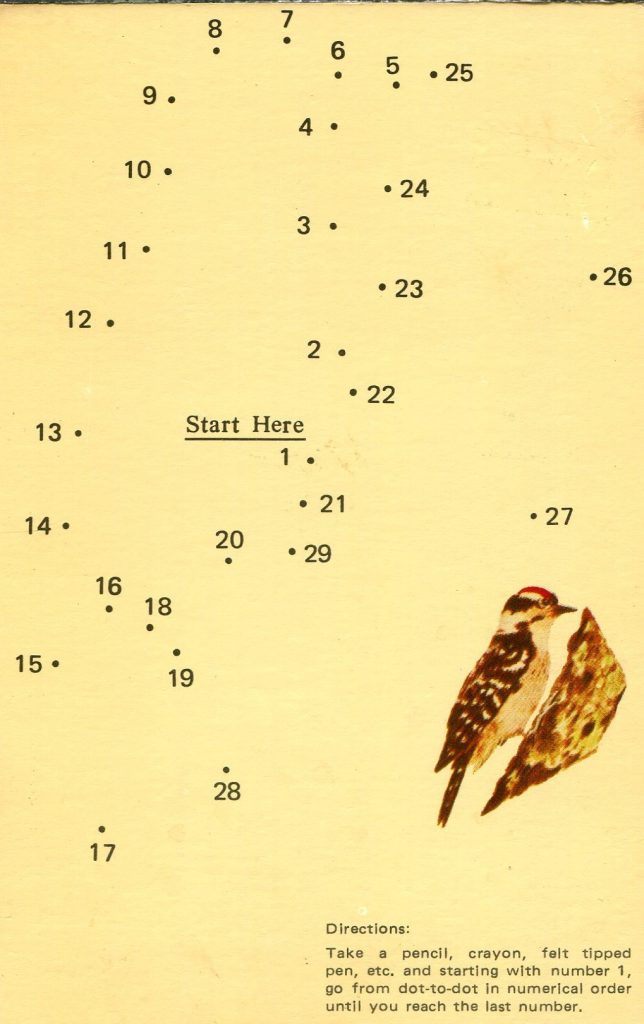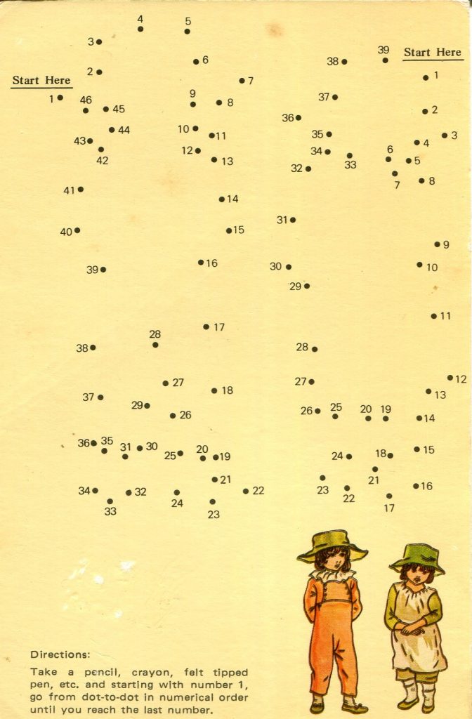 Just a little research led me to the origin of “dot to dot” games. An unexplained hint led to Scandinavia in the late 1940s and early ‘50s, where a graphic artist whose children were having trouble in number sequencing invented the dot-to-dot as an amusement. If the child counted properly and connected a series of numbered dots, a picture would result. It is a common problem for children under age 5 to count in proper order so the picture was the child’s reward.