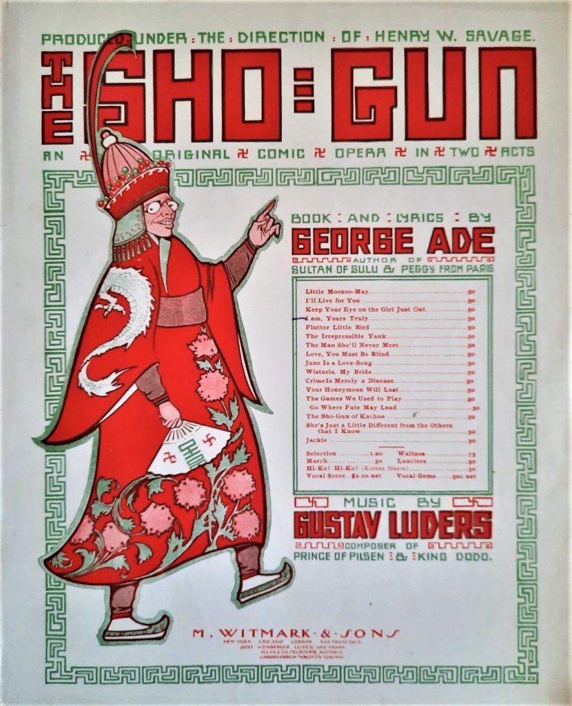 A comic opera is a musical play usually with light subject matter or a comic nature.  It generally has a happy ending and often includes spoken dialogue. This is a good description of the basic template of The Sho-Gun. George Ade was the author and Gustav Luders the songwriter. Ade was a well-known American writer, syndicated newspaper columnist and playwright.