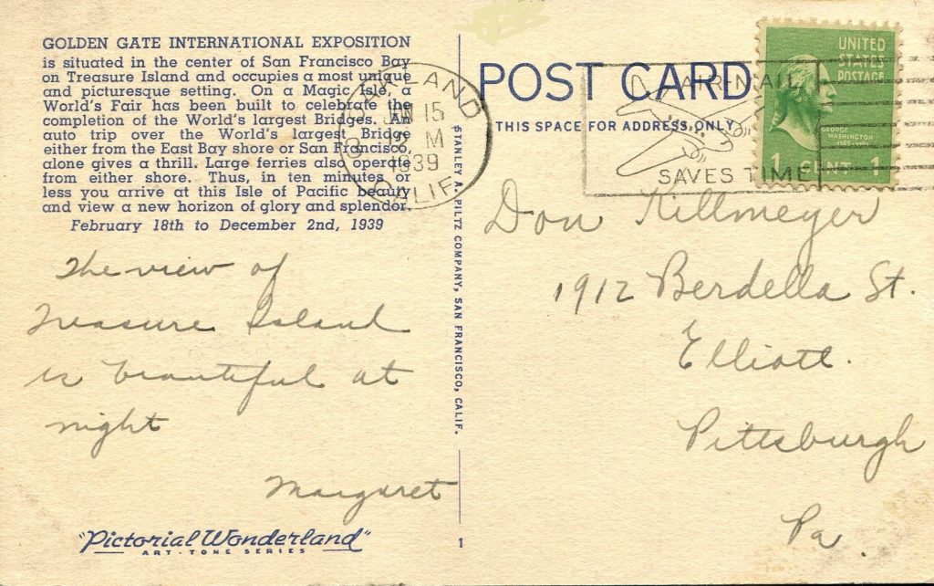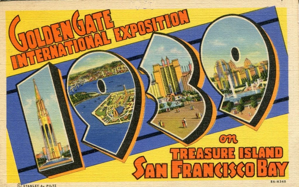 The likelihood that there are other LARGE NUMBER postcards is high, but this is the first I’ve encountered. This bright-colored linen comes from the Stanley A. Plitz Company of San Francisco. (Strangely it has a Curteich look-alike production number in the bottom right corner: 8A-H348 – which decoded would be the 348th linen (H) production number of 8 in A, the eighth year of decade A – CT code for the 1930s.) The Golden Gate International Exposition ran simultaneously in 1939 with the New York World’s Fair on Long Island, New York. The San Francisco event was a fair held primarily to celebrate the city’s newly constructed bridges – the San Francisco-Oakland Bay Bridge of 1936 and the Golden Gate Bridge of 1937.