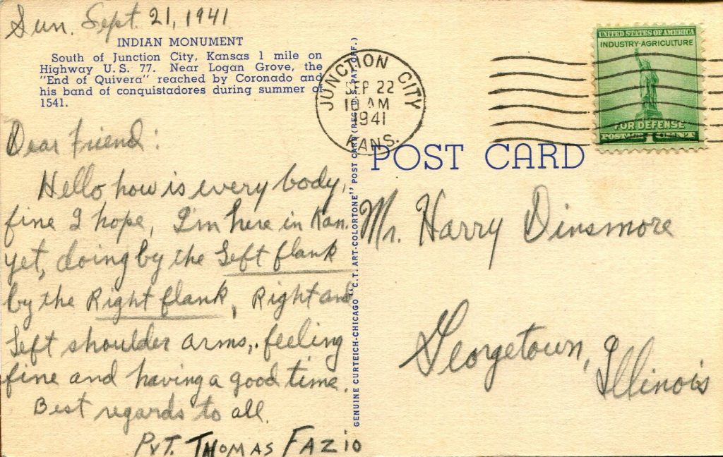 Sun. Sept 21, 1941 Dear Friend: Hello, how is every body fine I hope, I’m here in Kan. yet, doing by the Left flank by the Right flank, Right and Left shoulder arms, feeling fine and having a good time. Best regards to all. Pvt. Thomas Fazio