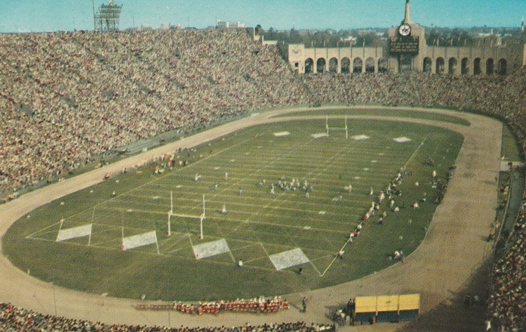 The Los Angeles Memorial Coliseum was built in 1923 to honor World War I veterans. Since its opening, it has been the home field of the University of Southern California Trojans. From 1934 to 1981, it was also the home of USC’s crosstown rival, the UCLA Bruins. When it opened, seating was 75,000 for college football. Seating increased to 101,000 for the 1932 Olympics and later in the 1930s exceeded 105,000. Until 1964, the coliseum’s capacity was 102,000. The caption on the 1950s postcard below indicates over 102,000 fans filled the Coliseum for a Saturday afternoon football contest. Current football seating is only 77,000.