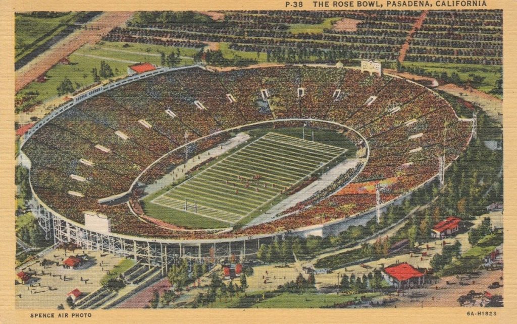 The Rose Bowl in Pasadena, California opened in 1922 and was originally a horseshoe shaped stadium. In 1928, stands were completed in the south end to complete the bowl. It was once the largest football stadium in the U.S. but has since dropped to tenth place. It originally seated 104,000, but now seats 92,000. The Rose Bowl was the home of the Caltech Beavers from 1923 until 1976, but they played to empty seats. The UCLA Bruins moved to the Rose Bowl in 1982. Since 1923, the Rose Bowl has hosted the postseason Tournament of Roses football game except for 1942 when it was moved to Durham, North Carolina due to the fear of a Japanese attack. Traditionally, the Rose Bowl is played on New Year’s Day but is moved to January 2 if January 1 falls on a Sunday.