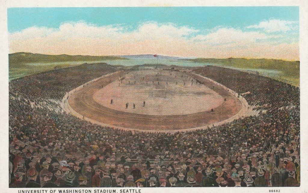 University of Washington’s Husky Stadium was built in 1920 and is located in Seattle on the shores of Lake Washington. Its original seating capacity was 30,000. The stadium has been expanded several times in the last hundred years and now seats 70,000. For the first sixteen years of its existence, Husky Stadium had an unusual dirt playing field rather than turf. The caption on the back of the postcard states, “A speaker can be heard from all parts of the stadium by the use of a magnavox, a mechanical contrivance that magnifies the voice of the speaker.” Husky Stadium could also be reached by boat.