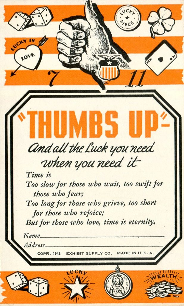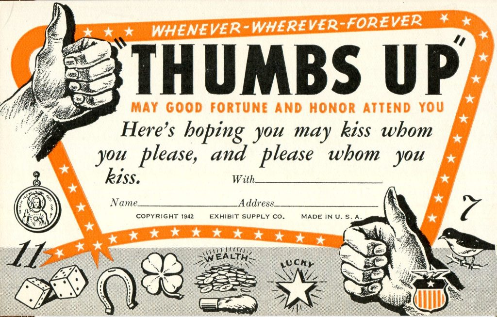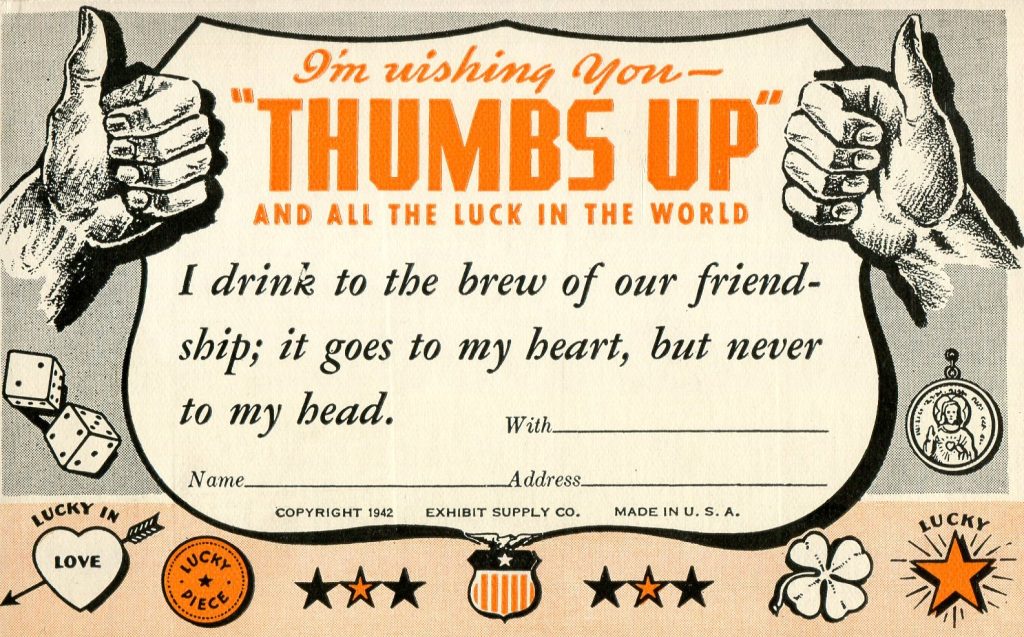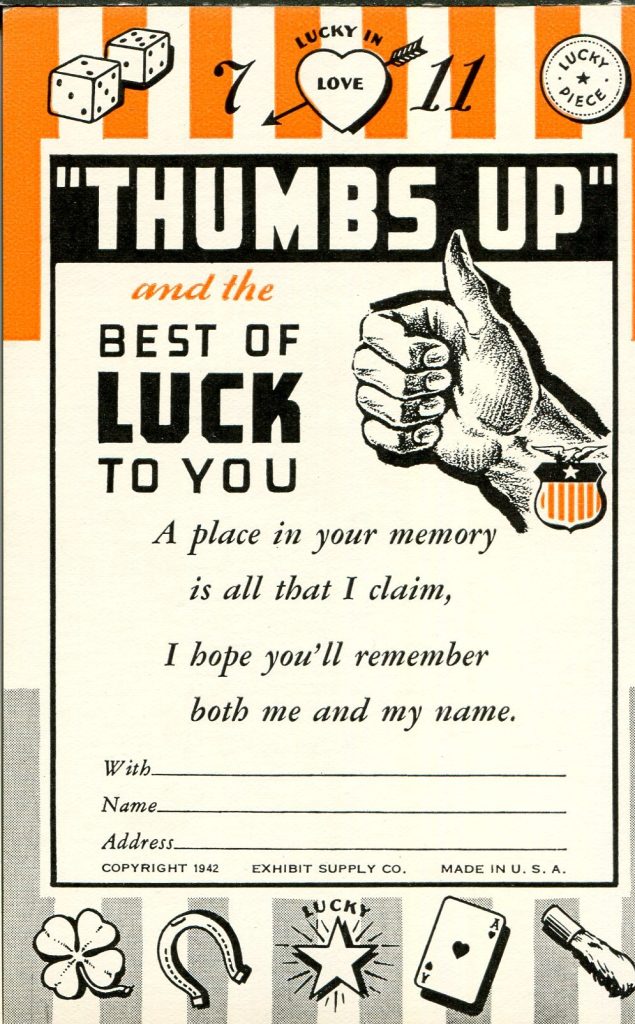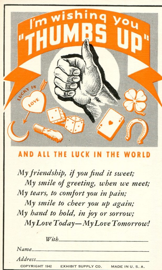 The Exhibit Supply Company of Chicago is a story for another time, but since this history lesson is examining the thumbs-up gesture, we would be remiss to omit one of the Exhibit Supply Company’s most successful products of the 1940s: their THUMBS UP series. The Thumbs Up series goes unmentioned in the Made in Chicago Museum’s website hence the information herewith is sketchy to say the least. The series of cards is comprised of at least twenty or 24 designs. There are a variety of possibilities but the most likely is that there are two sets of twelve cards; set one are horizontal cards with three designs of four cards each and set two are vertical cards with four designs of three cards each. (If any of this really matters to anyone, perhaps we should form a committee to investigate.) The series (or both sets) is printed on white 240# card stock in at least three shades of orange ink with black text and images. Each card features symbols of “luck” such as four-leaf clovers, dice, horseshoes, lucky stars, Saint Christopher medals, lucky coins, hearts, rabbit-foot charms, 7&11 numerals, blue-birds of happiness, and both left- and right-handed thumbs up. Additionally, each card has an esoteric slogan or adage, some of which make sense and some don’t. All have a ©1942 citation. So here’s a heart-felt thumbs up from Postcard History Online Magazine. May all your days be THUMBS UP days.