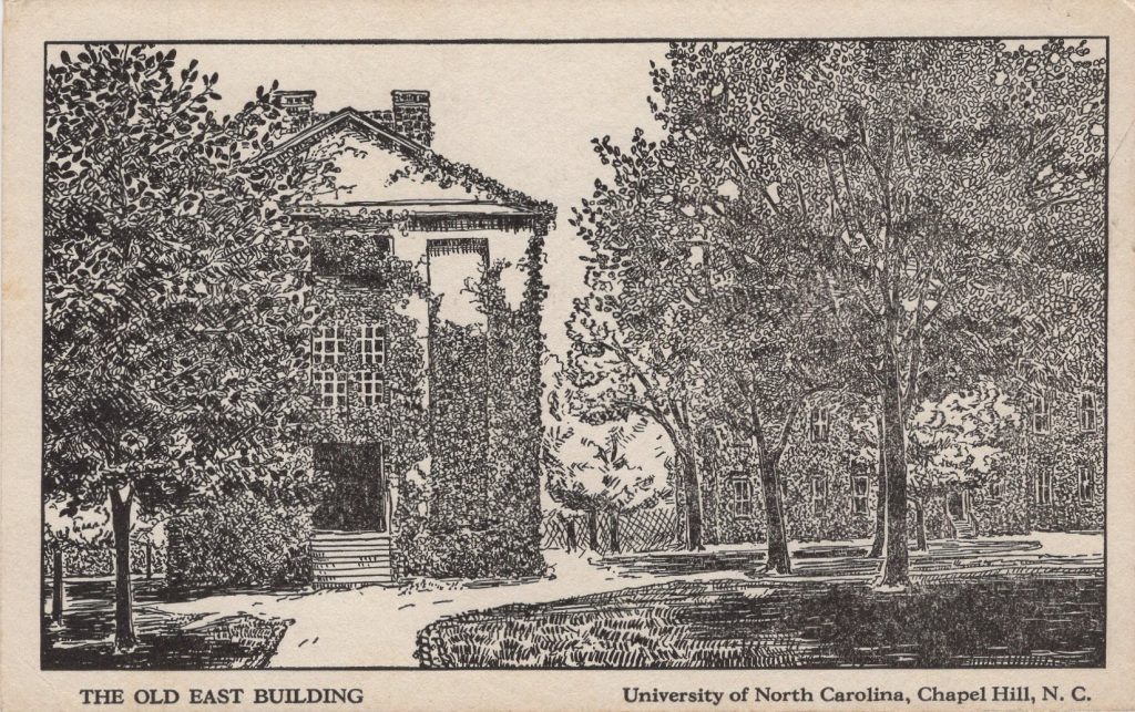 This card, Greetings from Chapel Hill shows many of the campus facilities today. The first building and indeed, the only building for two years, was a two-story brick structure called Old East. It is now a National Historic Landmark, and is the oldest state university building in America. It was where the first students reported.