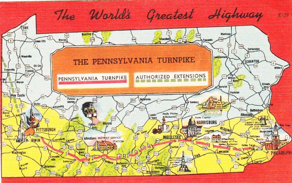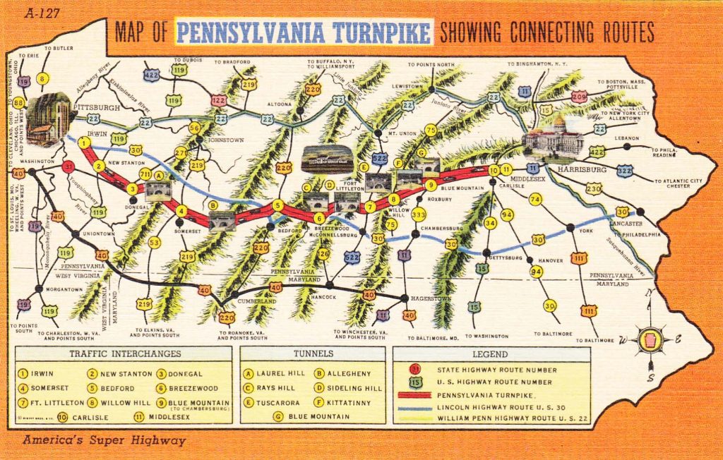 At the time there were already two toll-free roads which crossed the state: the Lincoln Highway (U.S. Route 30) and the William Penn Highway (P.A. Route 22). Both roads had severe limitations. The Lincoln Highway climbed over Pennsylvania’s mountains at steep grades; the William Penn Highway involved less mountainous terrain, but it offered a far from direct path across the state. If a new, more southern route could be built, driving time across the state could be substantially reduced.