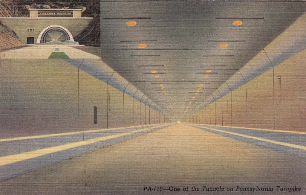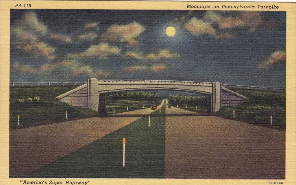 The lure of the open road, of driving on an endless ribbon of concrete into the setting sun with your windows down and the radio on, is a particularly powerful American fantasy. In a nation linked by interstates, freeways, thruways, expressways, and turnpikes such a fantasy is easy to fulfill. But in the days before eight-lane limited access, high-speed roads, such a thought must have been a dream. The first road in the United States to make that dream into a reality was the Pennsylvania Turnpike. When it opened in 1940, it offered to the American motorist a four-lane road without stop signs, or traffic lights, or intersections. No need to be caught behind slow-moving traffic, waiting for a clear stretch of road on which to pass. Here was a straight, flat ribbon of concrete, so safe that it didn’t have speed limits. “We had a new Mercury,” one early rider recalled, “and my brother had just gotten his driver’s license, and we drove a steady 90 miles per hour.” The American motorist had never seen such a road; so novel was it that on the day it opened motorists waited for hours for a chance to try America’s “dream” highway, to roar from one exit to the next and then back again.