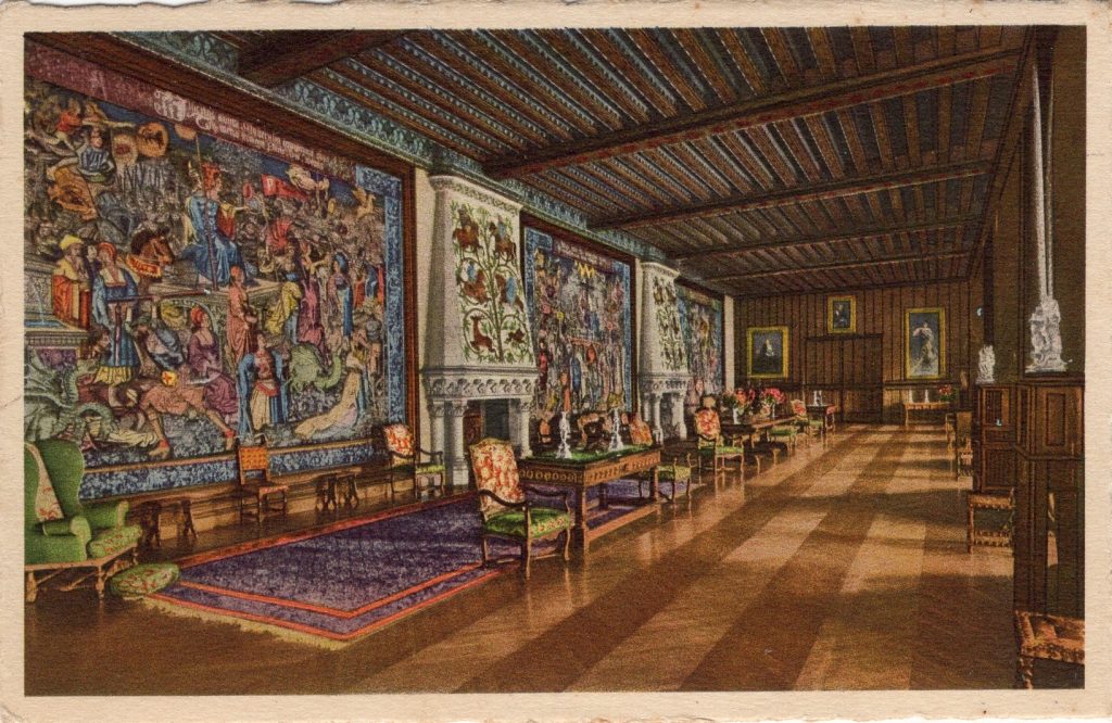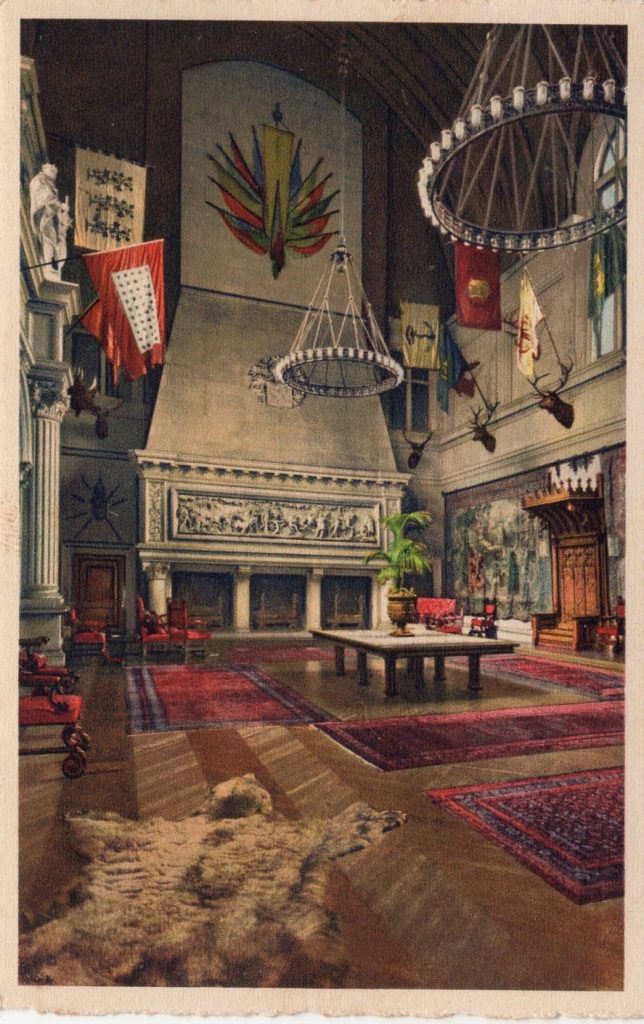 The banquet hall is the largest room, it measures 42 by 72 feet. The table has seating space for 64 guests. There is a 70-feet tall, vaulted ceiling. To the left of the entrance is the tapestry room that is 90 feet long. The library is two stories and holds 10,000 titles in eight languages.