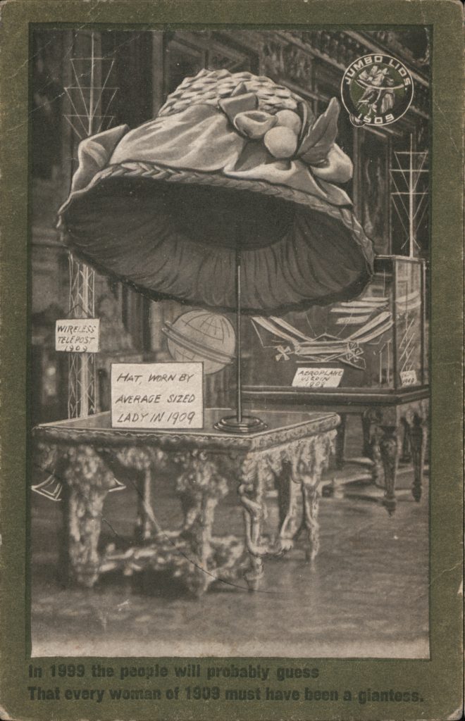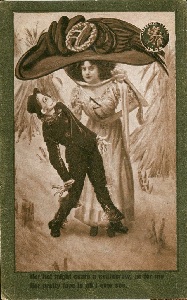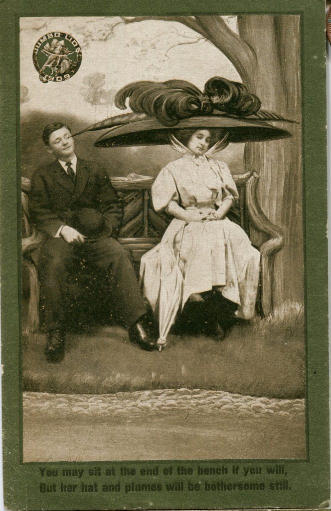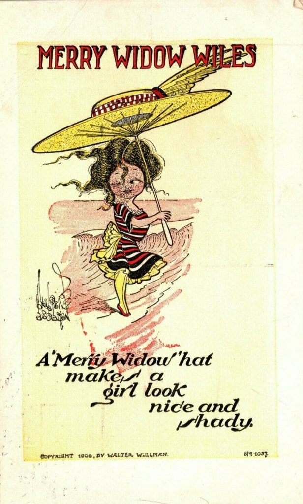 But the most remembered association, and the one most documented on the postcard, was with the “Merry Widow Hat.” For the London production, designer Lucile, produced a distinctive hat for actress Lily Elsie who played the widow. The general characteristics of that hat influenced millinery fashion in both Britain and the United States for the next three years.
