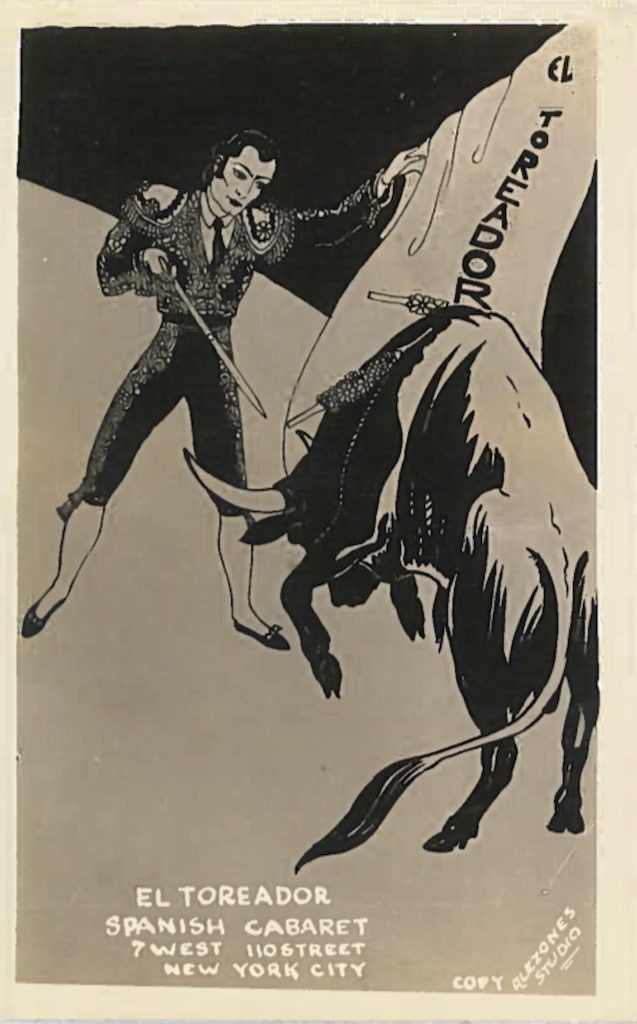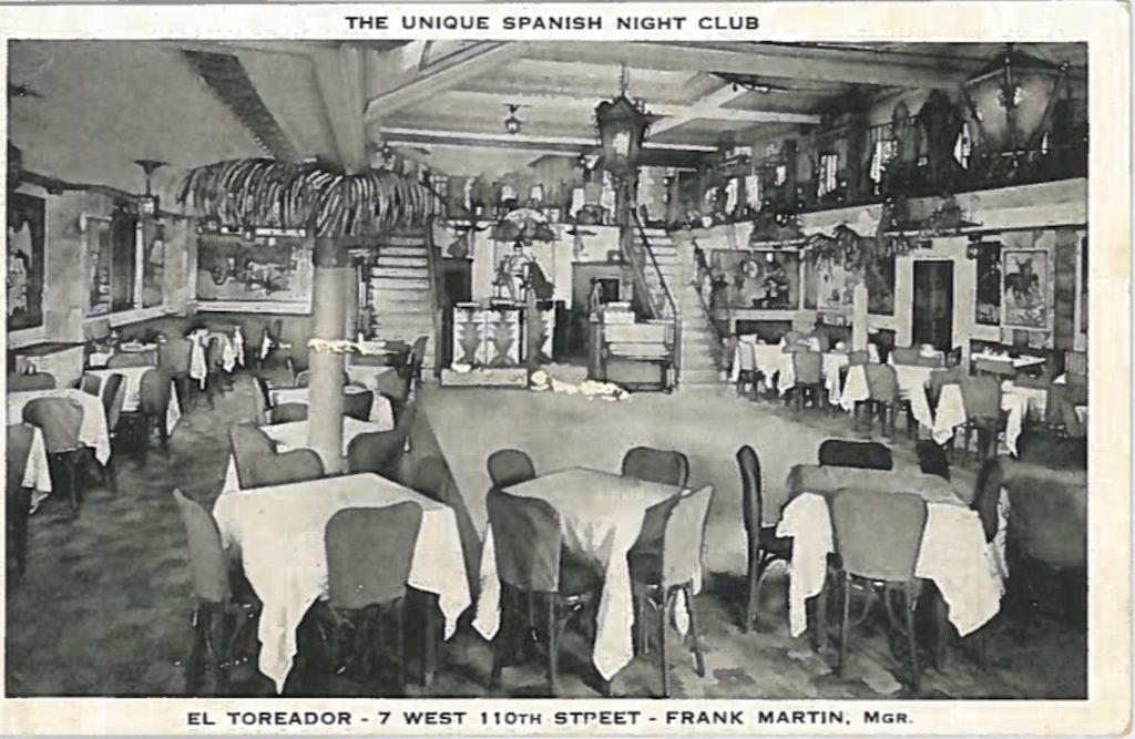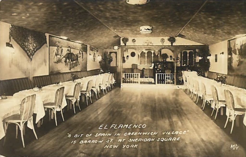 The first one out of the gate as early as 1925 was El Chico in Greenwich Village whose Spanish owner Benito Collado created the mold that energized the genre. Take a classic Iberian interior design, enhanced with Spanish popular culture, such as images of bullfighters, and offer some classic Spanish dishes such as Caldo Gallego (broth with cabbage and mixed greens) and Paella Valenciana (mixed seafood over saffron-flavored rice.) This real photo postcard shows just the place to enjoy these dishes and others.