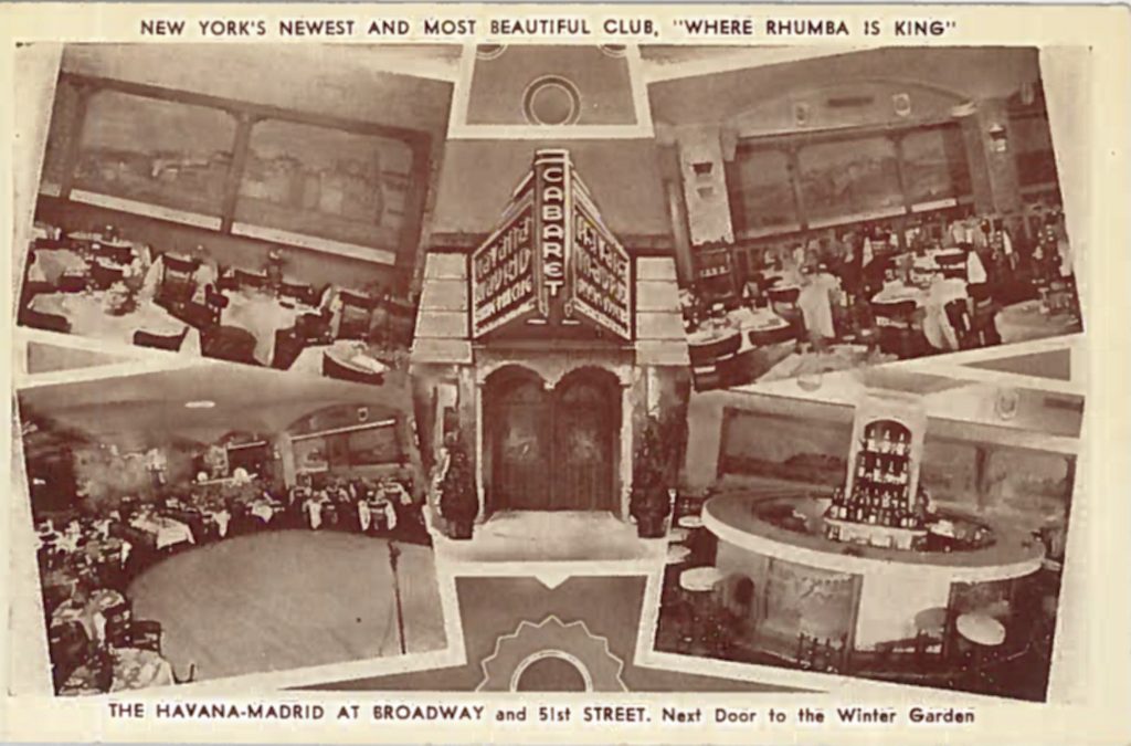 The Mambo Craze infected New York City nightclubs from the 1940s through the early 1960s. The trend can be traced to two primary factors: First, the tremendous immigration from Puerto Rico and Cuba. Second, the extraordinary visible success of a small cohort of performers with Caribbean roots – like Desi Arnaz, who played the leader of a mambo conjunto (music ensemble) in the era’s #1 leading TV show, “I Love Lucy.” Then, there was the superstar Xavier Cugat who excelled so much at both music and art, that the newly constructed ultra-chic club at New York’s recently renovated Waldorf-Astoria Hotel featured both of his talents. A wonderful 1940s linen postcard served as an exquisite souvenir for New York’s hottest club of the moment.