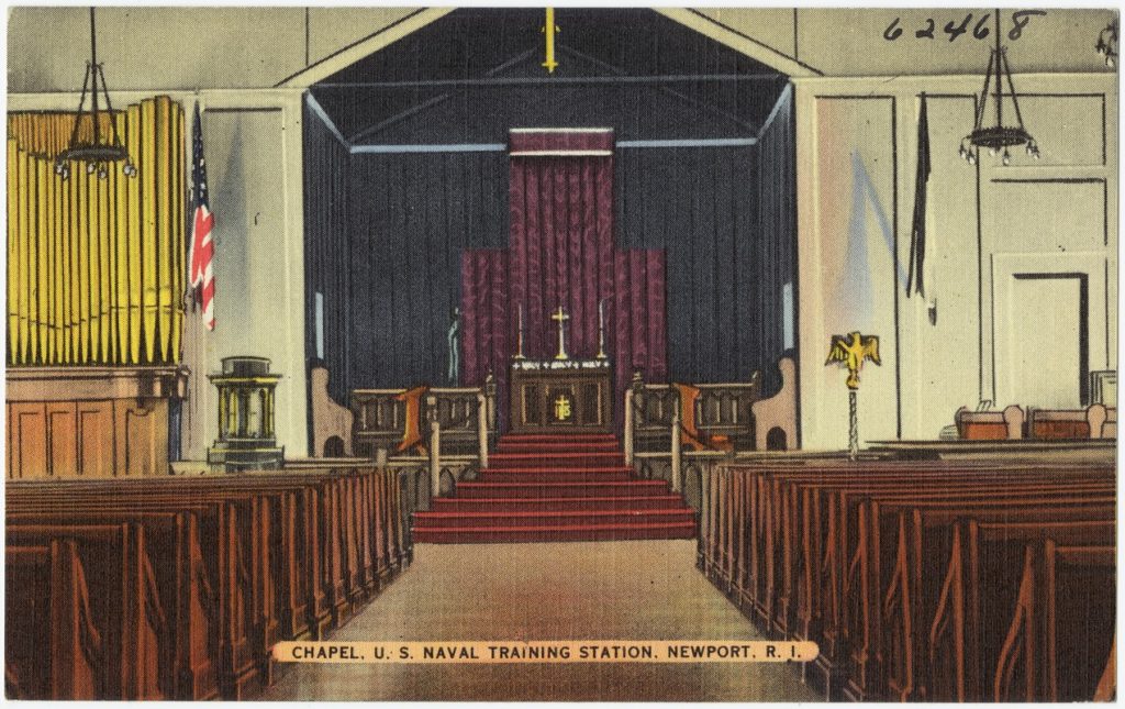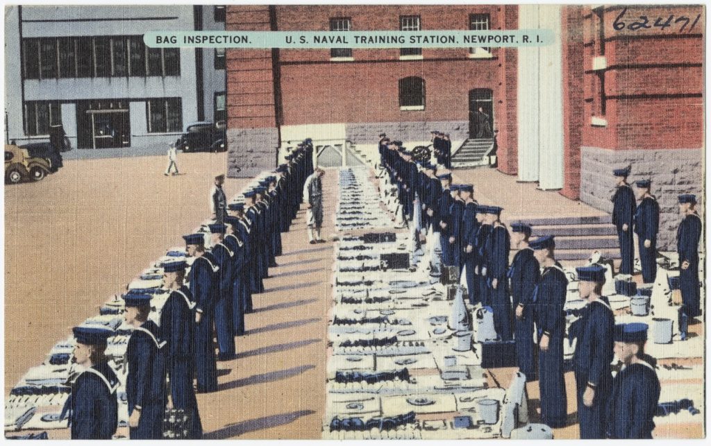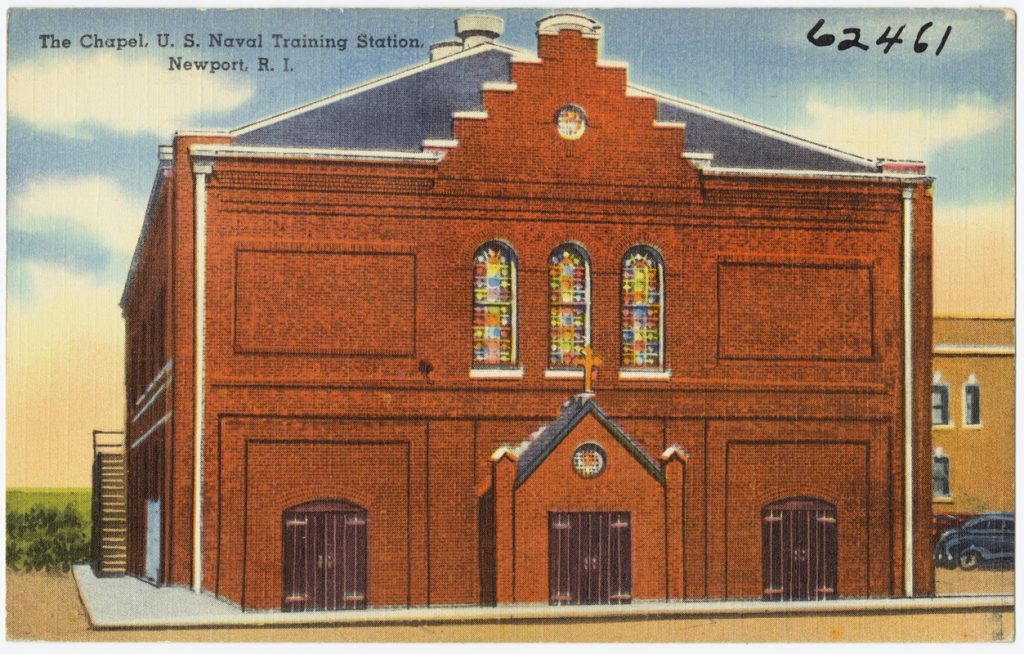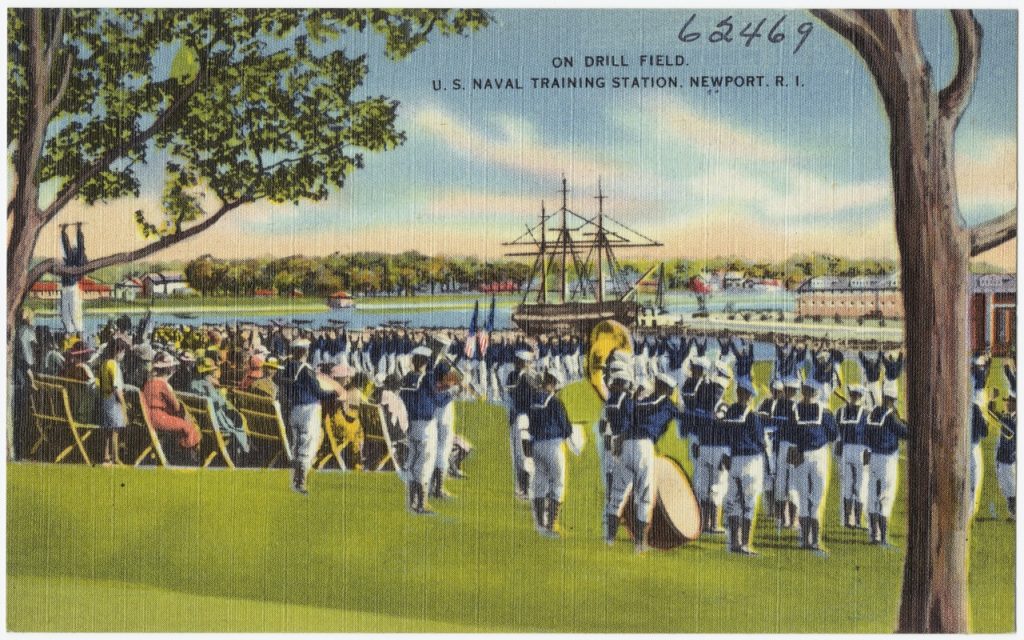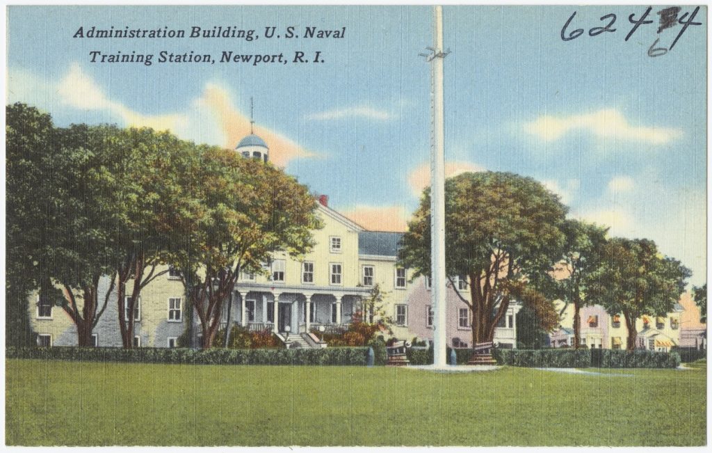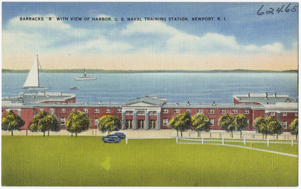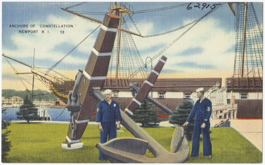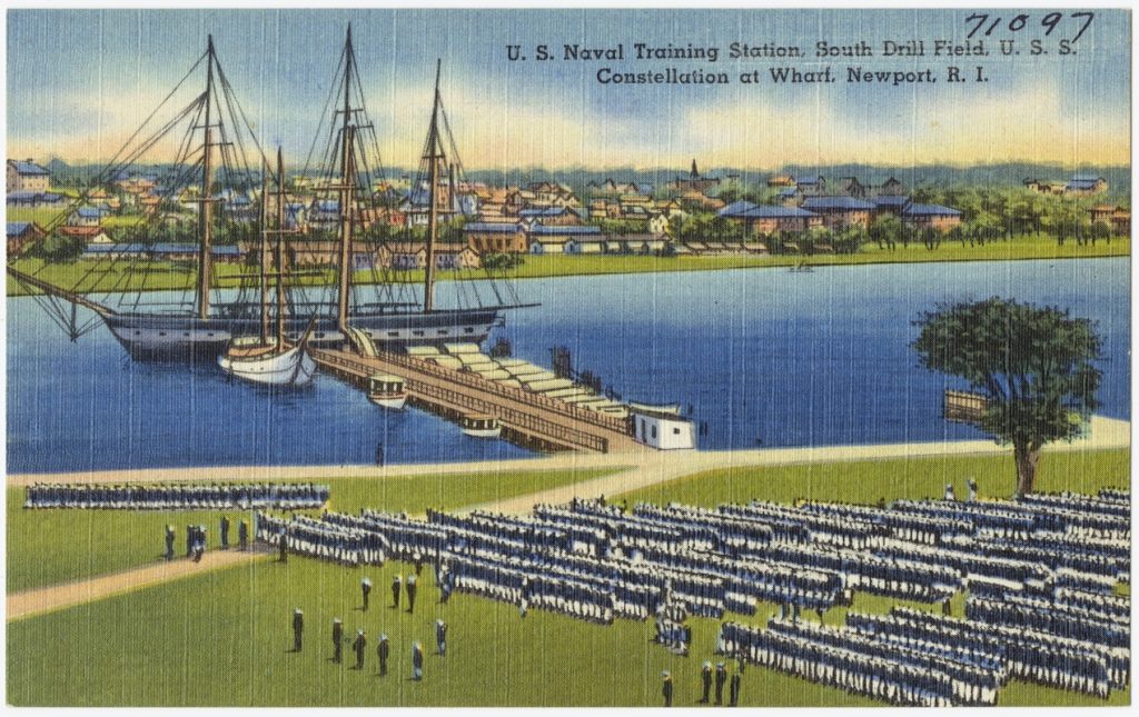 During those years when Constellation was anchored in Newport the Tichnor Postcard Company produced more than a dozen postcards of the Naval Training Center. Constellation figured prominently in Tichnor’s products.
