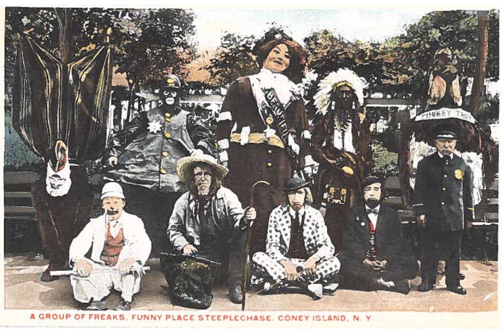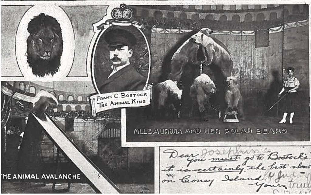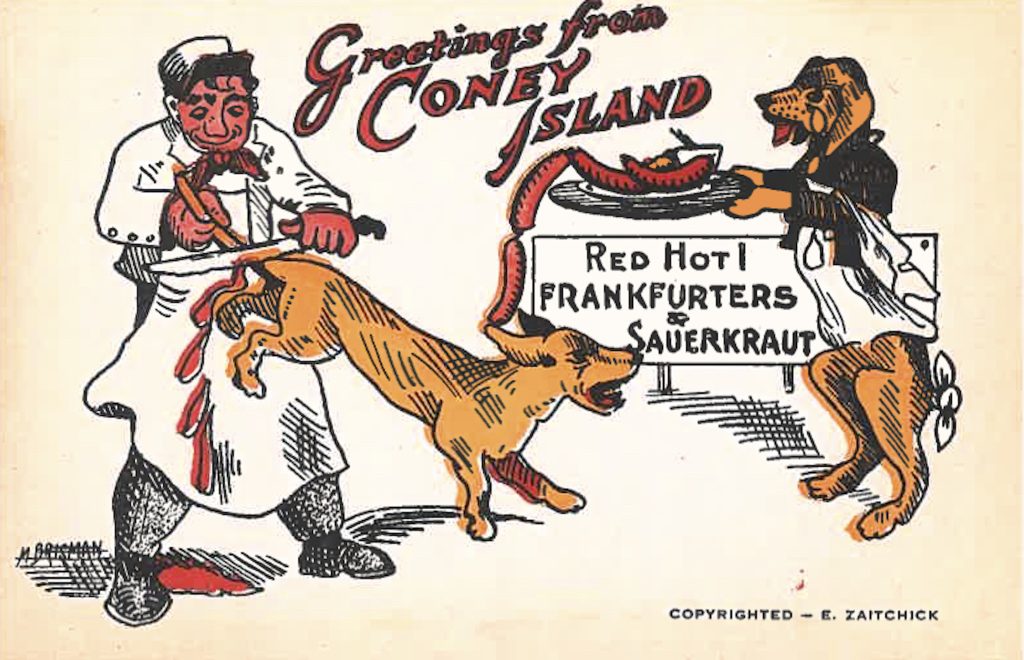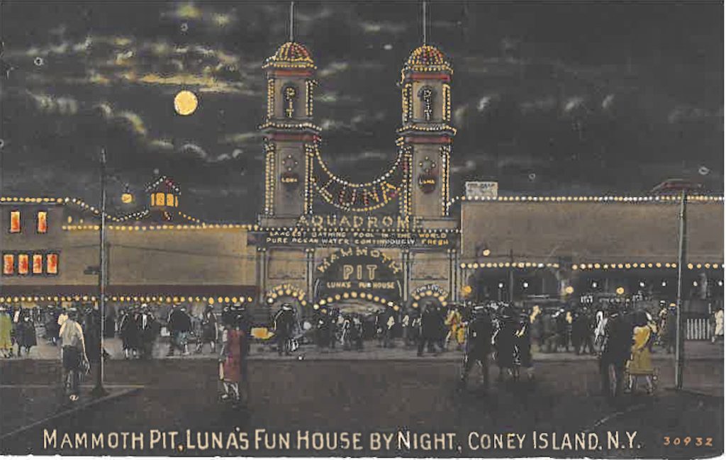 I’m glad you came back for Part 2 of Deciphering Coney Island. Part 1 was the last article in Postcard History’s third year; Part 2 is the first article of year four. We’ll spend more time looking at the rides and amusements at Coney Island. We will offer a thorough and sensitive analysis of the shameful “freak shows” and “human zoos” that brought crowds and cash to the exhibitors. We will examine the factors that led to Coney Island’s decline in the years following World War II. And we’ll provide the answer to that controversial question: What was Coney Island’s favorite food? * * * As improved transportation systems, subways and streetcars continued to bring crowds to Coney Island and new temptations were built to absorb them, the utopian impulse that animated much of the area’s early development began to dissipate. At first, Coney Island was expected to stand for American democracy and freedom from the strictures that interfered with individualism. Technology was expected to be mobilized to advance human freedom. Eventually the voices of the idealists were silenced a bit and the loudest were motivated by competition and sensationalism. Technology was mobilized to see who could produce the biggest, noisiest and the fastest rides. Not even Noah’s Ark, an exhibit where we would expect to see a huge vessel slithering silently toward a landfall, could avoid becoming surrounded by a roller coaster. Coney Island produced its share of traditional rides, like merry-go-rounds and miniature railroads that appeared all over America through the early 20th century in carnivals, parks, and fairs. Immigrant craftsmen from Europe were meeting a desire for new structures of leisure in demand by citizens in growing cities everywhere. The “Coney Island Style” of merry-go-round’s horses were uniquely ornate with large, bejeweled saddles atop highly animated carved creatures. The miniature railway at Dreamland ran through a Swiss Alpine landscape, imitation Venetian canals with gondolas and on through the park’s human zoos. One called the “Lilliputian Village” was inhabited by three hundred dwarves, the other a fantasy about the Igorot people of the Philippines, and finally, the railway ran through a firefighting exhibit. The multi-ethnic Philippines, a South Pacific archipelago had recently been acquired by the United States as a protectorate following the Spanish-American War, along with several Caribbean colonies, like Cuba and Puerto Rico. Curiosity about the Philippines was turned by entertainment producers into treating one of their ethnic groups like confined prisoners while Coney Islanders gawked at their nearly naked costumes and fervid ceremonies. The human zoo represents the underside of Darwinian thinking applied at a time when ideas of social and cultural superiority were considered respectable, and imperialism was the order of the day. Postcards without self-consciousness or guilt depict these as human curiosities rather than as mistreatment of other human beings without cause, just for being different. This happened not only at Dreamland but as this postcard of East Indian Natives shows, also at Luna Park. But that’s not all. The growth of the amusement park at Coney Island came at a time when people suffering from deformities or disfigurements from severe injuries of birth or battle were regarded as “freaks” without regard to their feelings about being relegated to an offensive social category. Many of these folks were encouraged to display themselves in “side shows” among the amusements. Producing postcard imagery depicting their deformities was a way of making money. When Dreamland was created in 1904 by Brooklyn real estate developer and former state senator William H. Reynolds, it was intended to be a classier and more refined alternative to Luna Park.  Competitive realities ensured that these ideals did not last long. By the time the park burned in 1911, Dreamland had installed its own version of the Loop the Loop and tried to keep up with independent roller coaster operators who claimed to have the largest and the fastest. Dreamland also featured the side show and a hotel managed by one of their partners the Dicker family. Luna Park, however, was said to be better managed and simply kept expanding more profitably. In what was probably the height of side show sensationalism, Dreamland featured a set of infant incubators – not yet approved by hospitals – for premature babies, in this case triplets who were members of the Dicker family. We’re happy to report that two of the children survived to adulthood, although early press reports worried that all had been consumed by the flames. Another publicity stunt upended by the conflagration, involved Broadway starlet Marie Dressler who had been recruited as team leader for a group of boys dressed as imps in red velvet, selling peanuts and popcorn at the park.  Part of the story line involved a love affair going on between Dressler and the dashing one-armed, handlebar-mustachioed Captain Jack Bonavita, lion tamer at Bostock’s Menagerie who had acquired his injury in a taming accident. Captain Bonavita performed heroically as the fire raged but between those lions that escaped and were shot and those tragically locked in their cages about 60 animals were lost when the fire destroyed Dreamland. Luna Park did not necessarily do well when its main competitor was destroyed. After hitting a peak at the end of the first decade of the 20th century, when all three parks and many independents were active, Coney Island went into a long, slow decline. The high flying 20s had to deal with Prohibition and the 30s experienced the Depression. Luna Park was constantly challenged to keep its offerings fresh and to eliminate rides and spectacles that were no longer attracting customers. Ownership and management changed constantly. By the end of the 30s, things began to feel tawdry and dated. Even the side sh