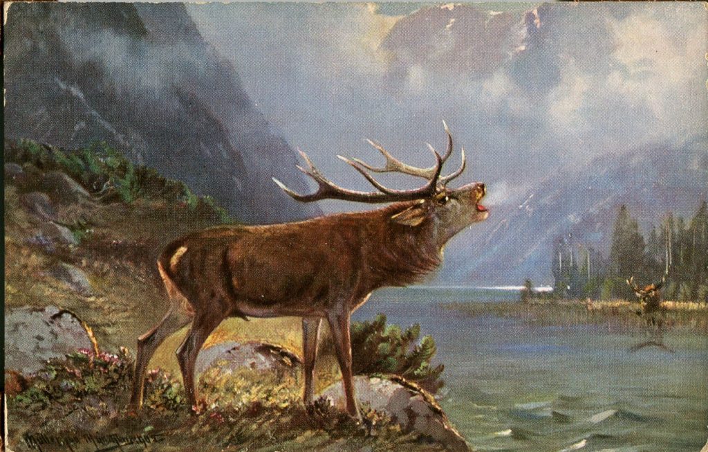 - The card on the right shows a family of red deer. After the moose, red deer are my favorite antlered animals; I would watch them for hours if I ever got a chance. The male red deer is called a stag or hart; the female is called a hind. Have you traveled in the British Isles? If you have, you certainly have seen pubs with names like the Red Hart Inn or The Inverness Hind. Drink up!