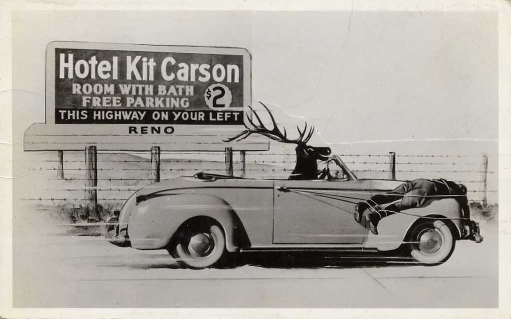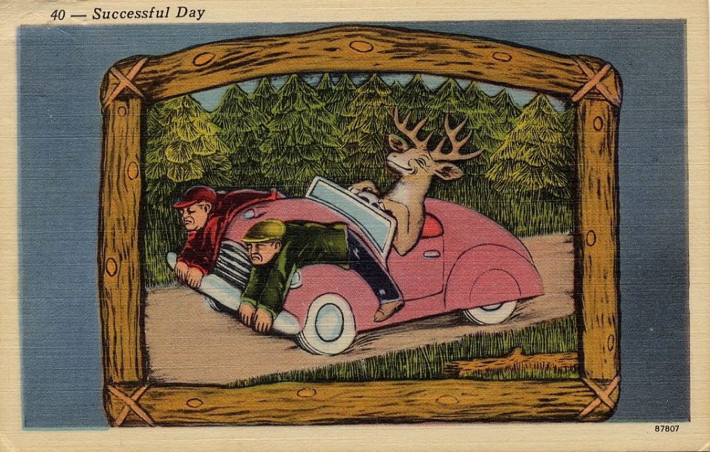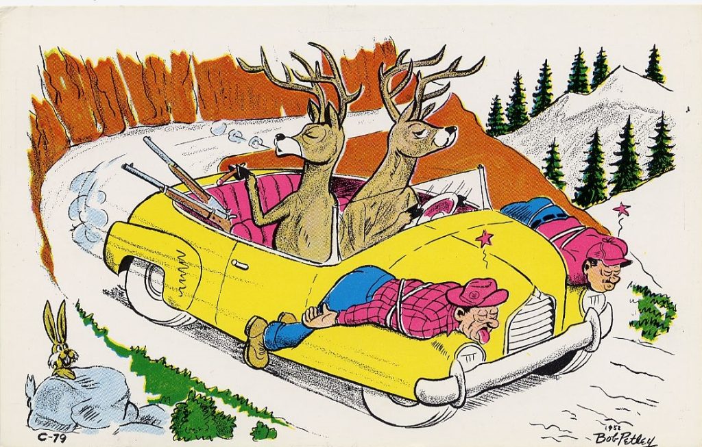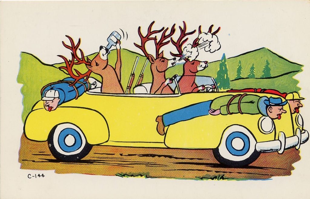 The cards shown here were produced from the 1940s to the ‘70s. The subject of most of them is one or more deer driving a car with their human prey tied to a fender, but a few cover other episodes in the hunting experience.