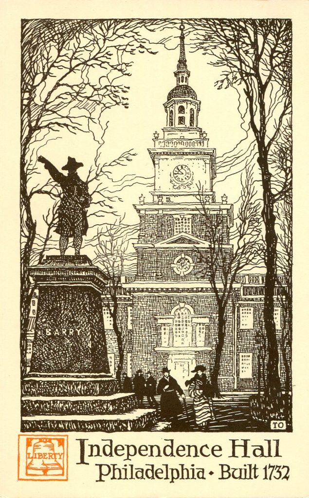 Above left, is a modern card created for the National Park Service, showing Independence Hall as it is seen today. On the right is card No. 9 from a multi-card set published by the Philadelphia Art Alliance. The art is the work of Thornton Oakley.