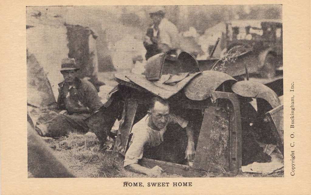Events of the 1930s are not well documented on postcards. The postcard craze had long since passed and no doubt few people had money enough to buy cards. The nation was too preoccupied with its economic survival. The Bonus Army’s shantytown was hardly an attractive subject for view cards. So far though I’ve found two groups of cards connected with the BEF. The first is a set of commercially printed cards done by C. O. Buckingham, Inc. These black and white half-tones on a cream-colored stock were published by Clinton O. Buckingham, 19 T Street NE, Washington, D.C. Twenty-two titles are known, all of which are views of life at Camp Marks. The Camp and its residents were favorite subjects of photographers.