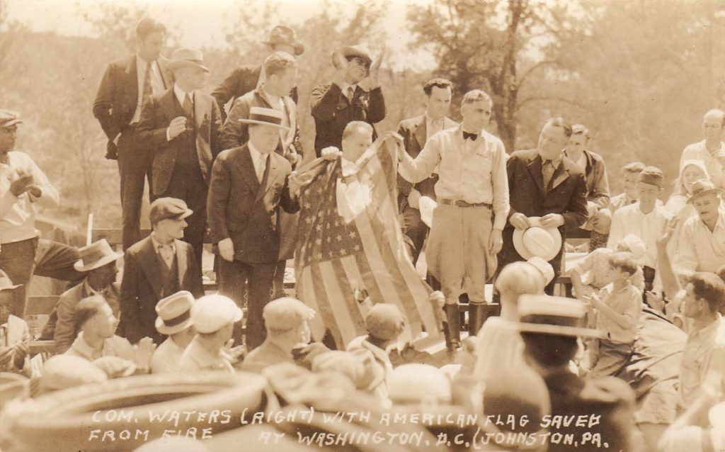The BEF was born of the veterans’ frustrations—why not carry their cause to Washington? Apparently the first plan was hatched in Portland, Oregon, in the Spring of 1931. One of the earliest to sign was Walter W. Waters, who was eventually chosen as “commander” of the BEF. The initial group of veterans, numbering less than 300, left Portland by hitching rides on boxcars in May. An “advance” man was sent ahead to drum up support for the army from local civic and veteran groups. Everything went smoothly until the contingent reached the east bank of the Missouri River at Council Bluffs, Iowa. Here railroad executives, local police, tried to end the free ride across the country. Such confrontations only attracted more national attention and in the end the 300-man Portland group was trucked across Illinois, Indiana, Ohio, Pennsylvania, and Maryland by each state’s National Guard.