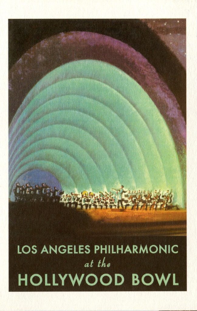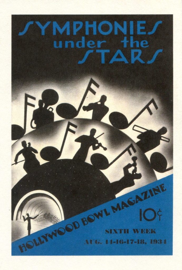 [A special note on the graphic: any one familiar with the production Fantasia from the Disney Studio, will recognize the art deco artwork associated with that animated feature film released in 1940. Leopold Stokowski conducted the score for the film – mostly with the Philadelphia Orchestra – but the artist has unmistakably associated Stokowski and the film score with the Hollywood Bowl.]