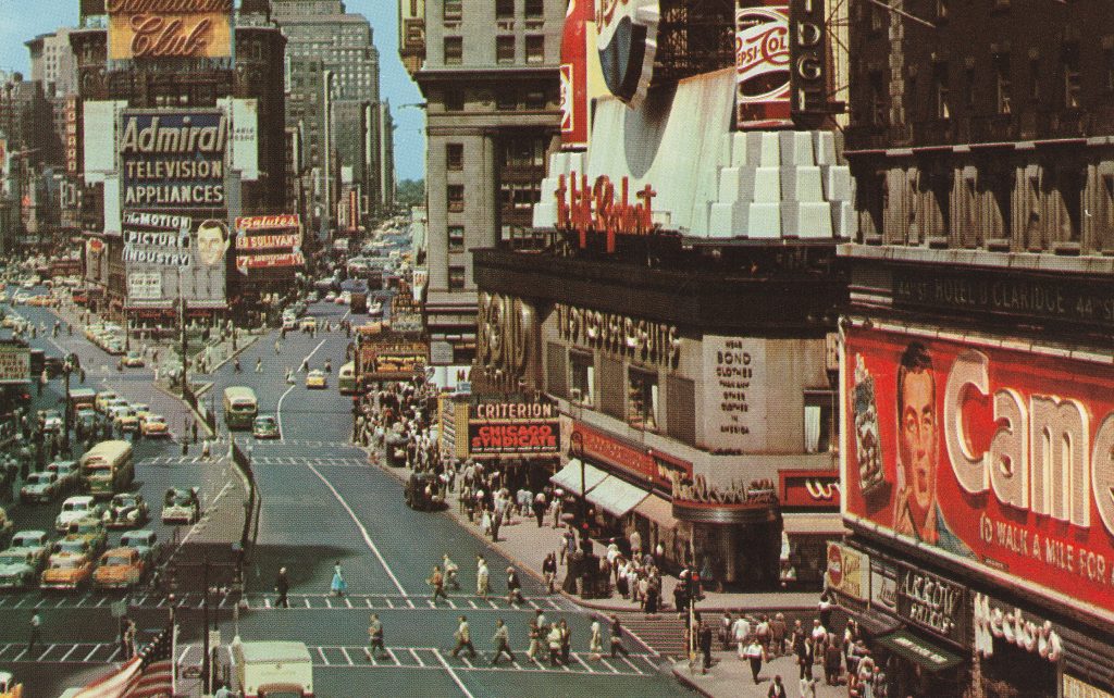 I was 13 in 1955, and went from NJ by train to Times Square NYC to hang out with my buddies (wonder if we are on that postcard?). We had just a few dollars, and always had lunch at Tad’s Steak House (small steak, baked potato, and roll) for $1.50.