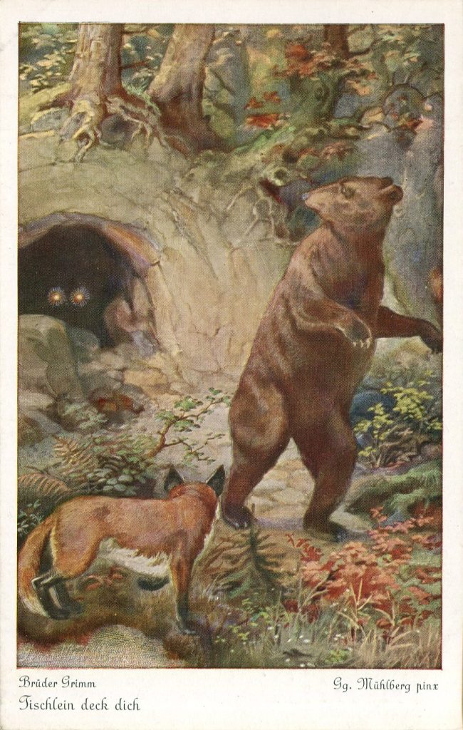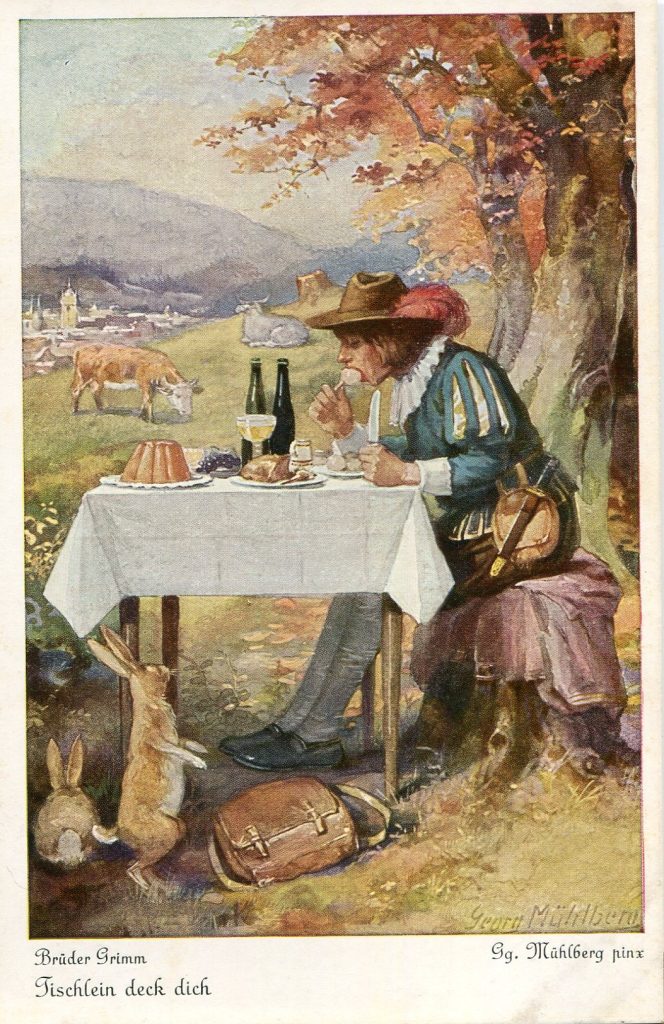 Georg Mühlberg was not the only early 20th century artist to illustrate The Wishing Table. Arthur Rackham, the famous British artist did the illustrations for a new English language edition of Grimm’s tales in 1917. Rackham became famous after he illustrated Peter Pan, Alice in Wonderland, Gulliver’s Travels, and Rip Van Winkle.