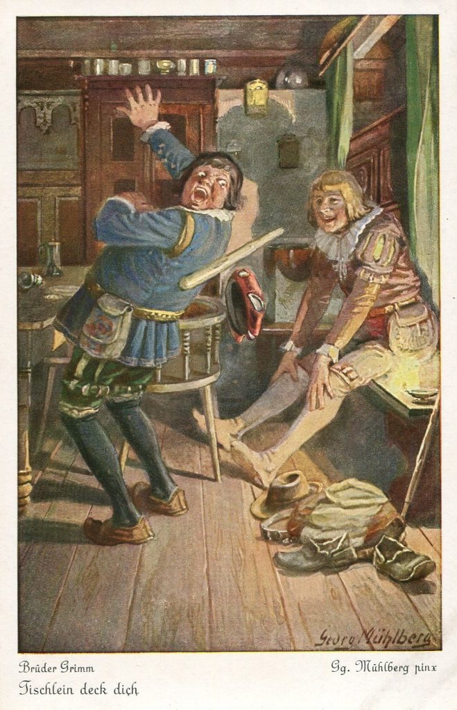 While the father waits, he remembers that his first son went to a maker of furniture to learn the craft. After his service his master gave him a magic table as a sign of gratitude. Whenever the lad said, “Table, Deck Yourself” the table decks itself with the finest food and wine. The son decides to travel home and show his father what he learned and earned. On his way he visits a local inn, where he demonstrates the powers of the magic table. At night the inn keeper steals the table and switches it for a normal table, without the son being aware. When the son arrives home and tries to show the powers of the table to his father nothing happens, which upsets his father once again.