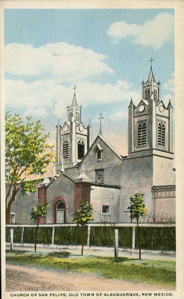 The Church of San Felipe in Albuquerque, New Mexico, was established long before (1706) the present church was constructed in 1793. The second church had a more sophisticated design than the older one. The newly designed structure was more like European churches and had two bell towers. A rectory (often called a “convento”) was added for the Franciscan friars assigned to the parish.